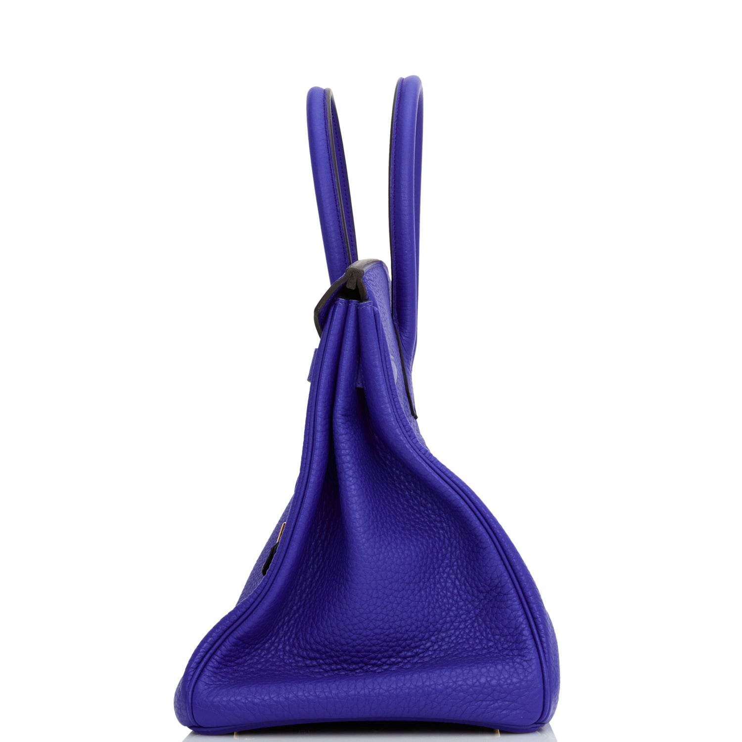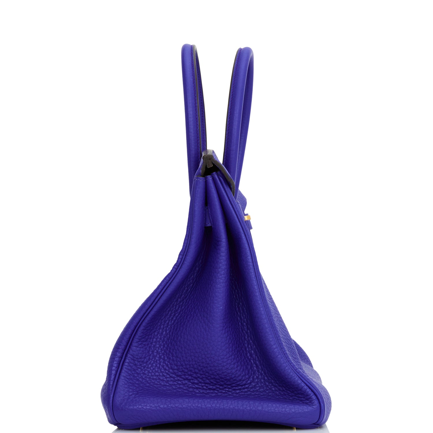 This Special Order Birkin is in Bleu Electric clemence leather with gold hardware and has tonal stitching, front flap, two straps with center toggle closure, clochette with lock and two keys, and double rolled handles.
