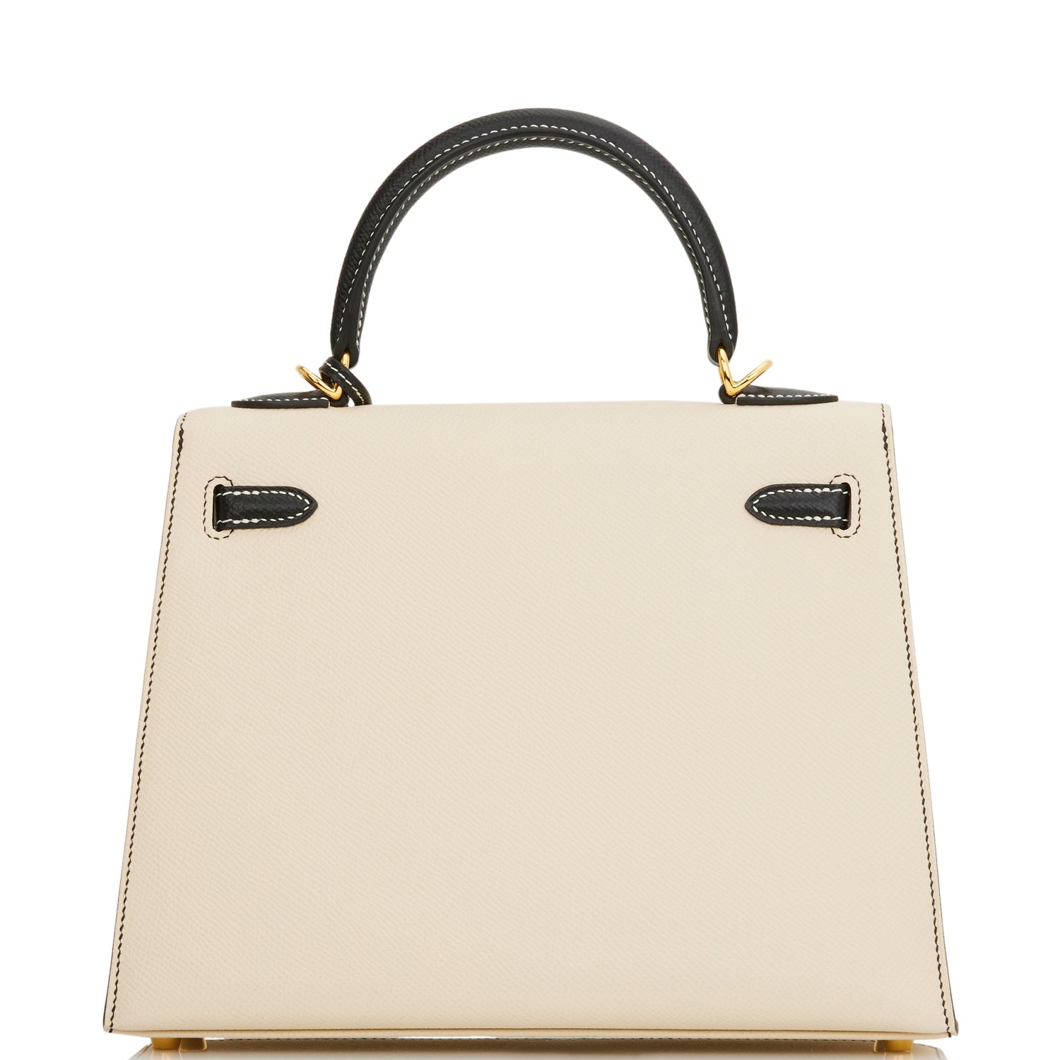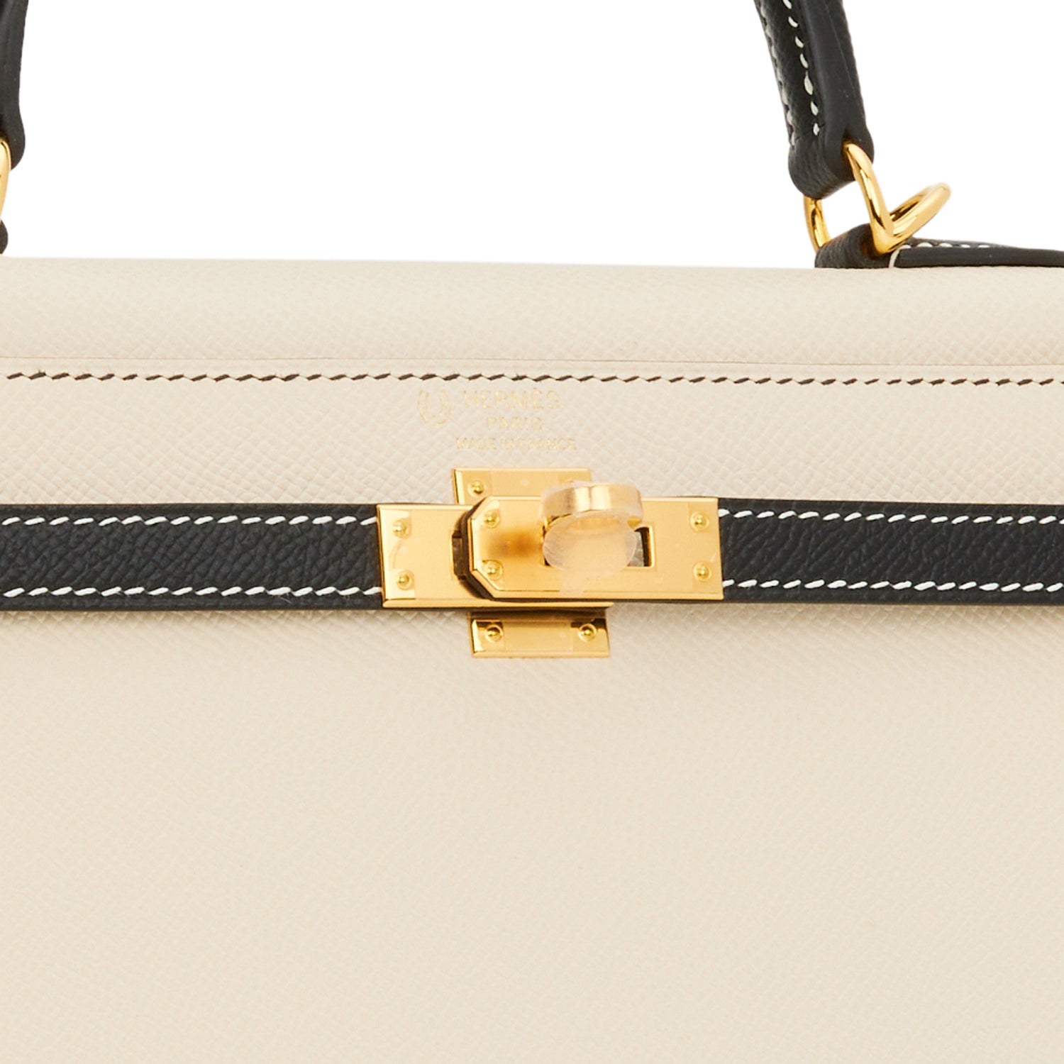 This Special Order Kelly, in the Sellier style, is in Nata and Black epsom leather with gold hardware and has contrast stitching, two front straps with toggle closure, clochette with lock and two keys, single rolled handle and removable shoulder strap.