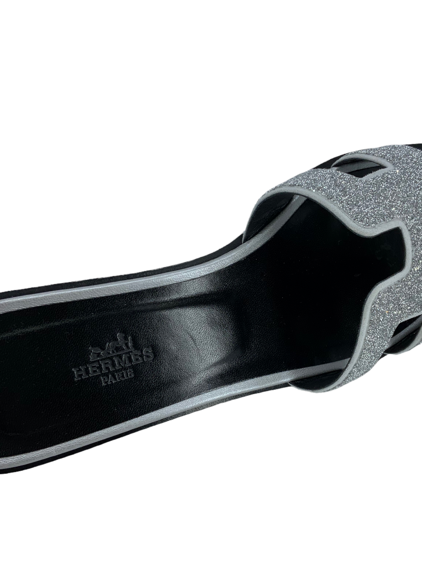 This pair of HERMES Suede Goatskin Oran Glitter Sandals Size 9 (IT 39) define simple elegance. Expertly crafted from supple gray suede with a glitter-embellished 'H' logo and smooth black leather foot-beds.