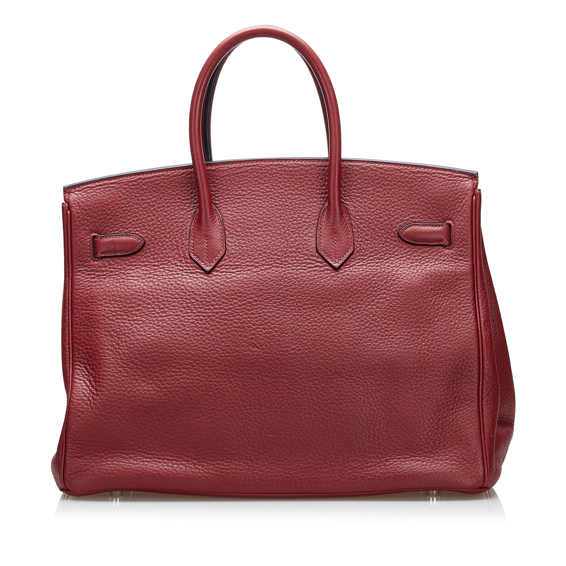 The Birkin 35 features a leather body, rolled leather handles, a flap with pull through and twist lock closure, and interior zip and slip pockets.