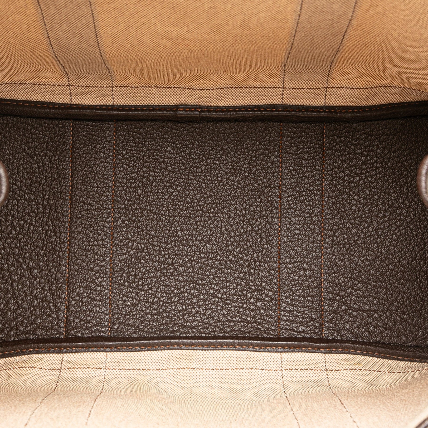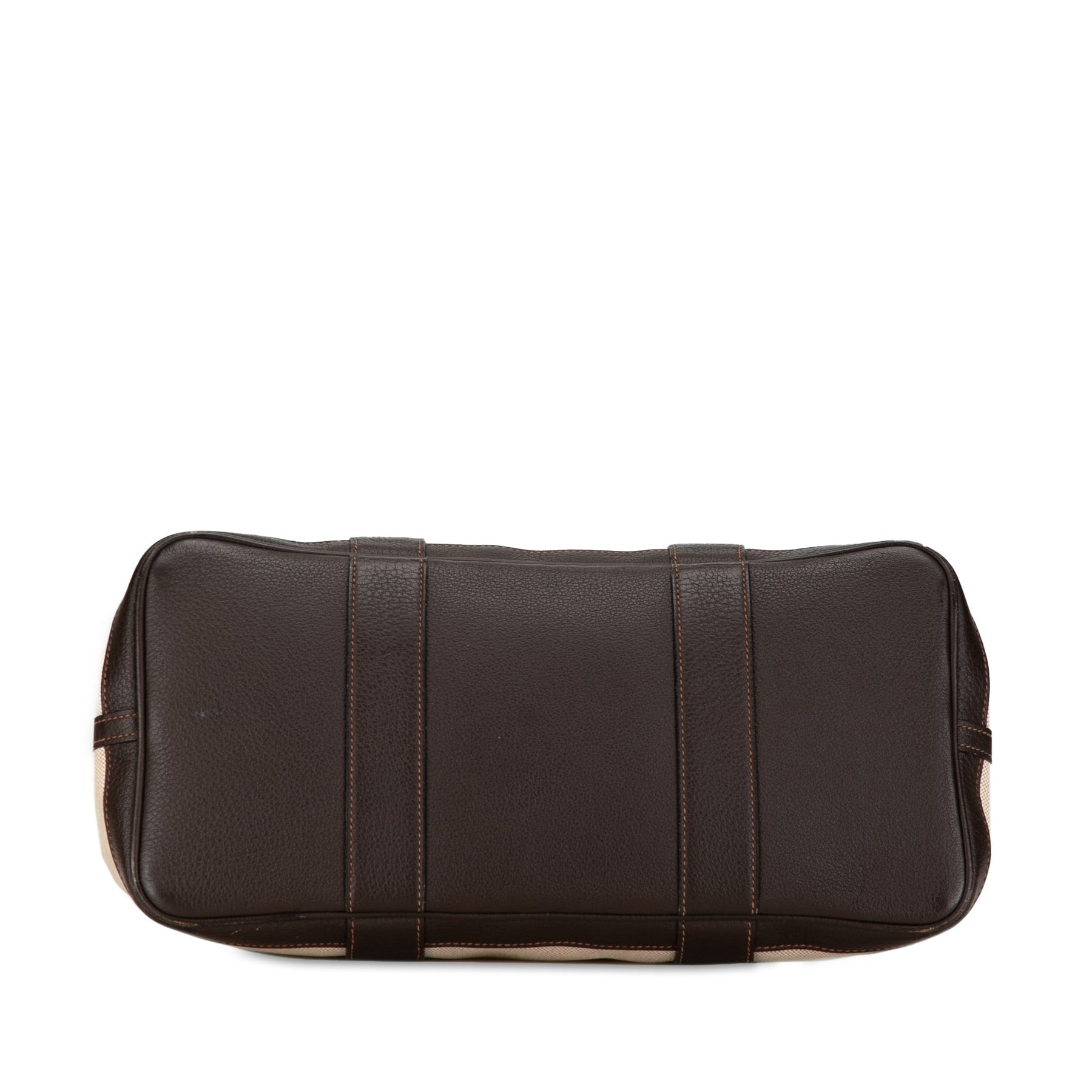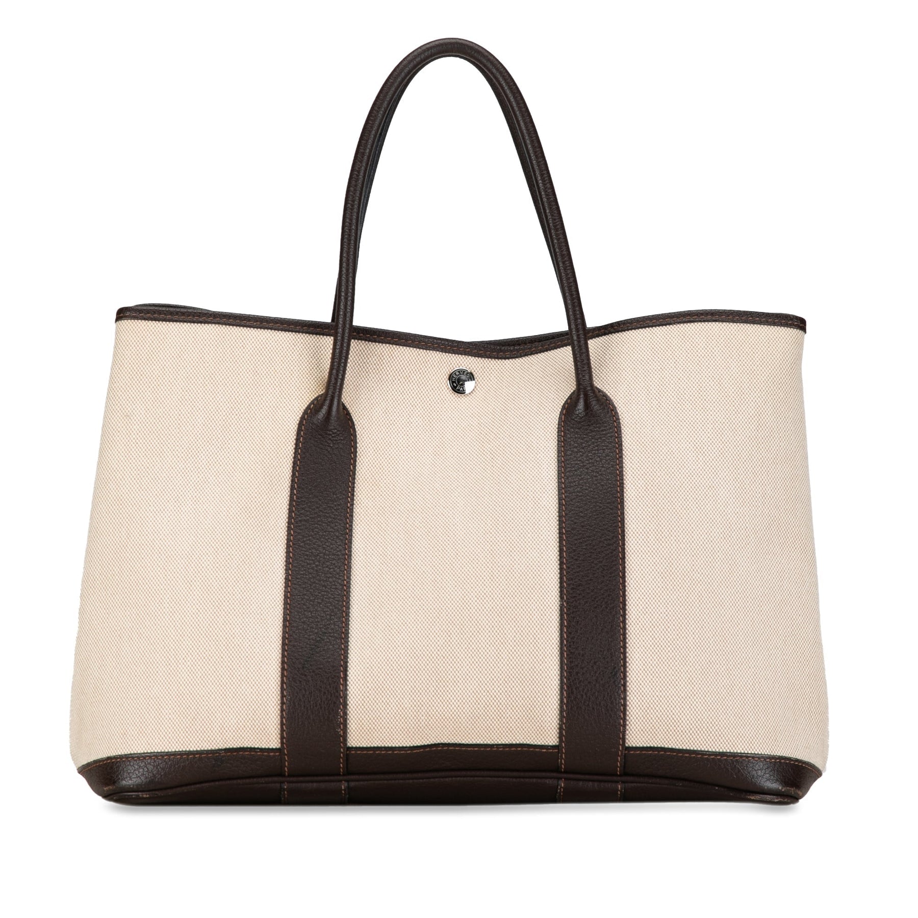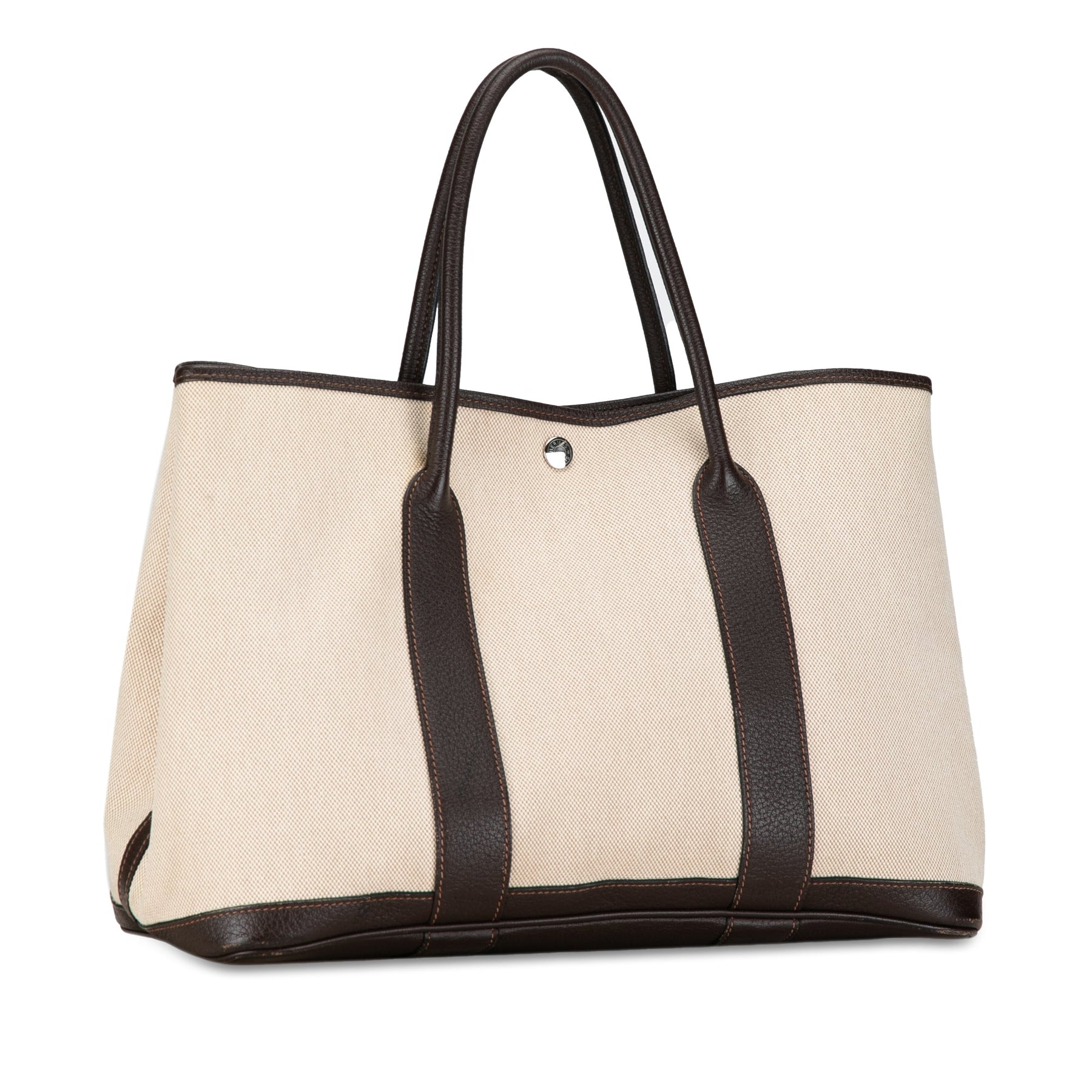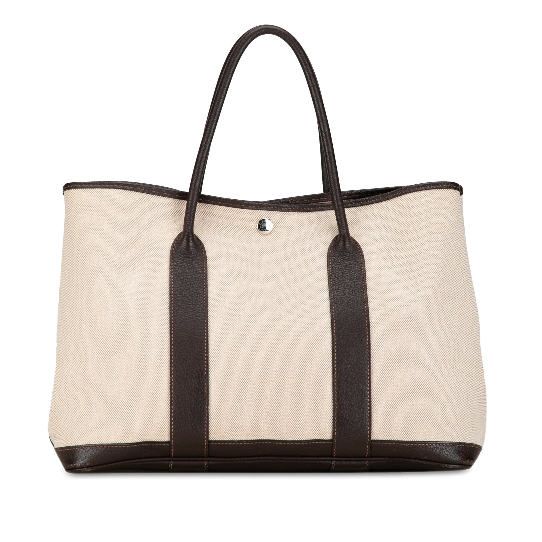 The Garden Party 36 features a canvas body with leather trim, rolled leather handles, and an open top with snap button closure.