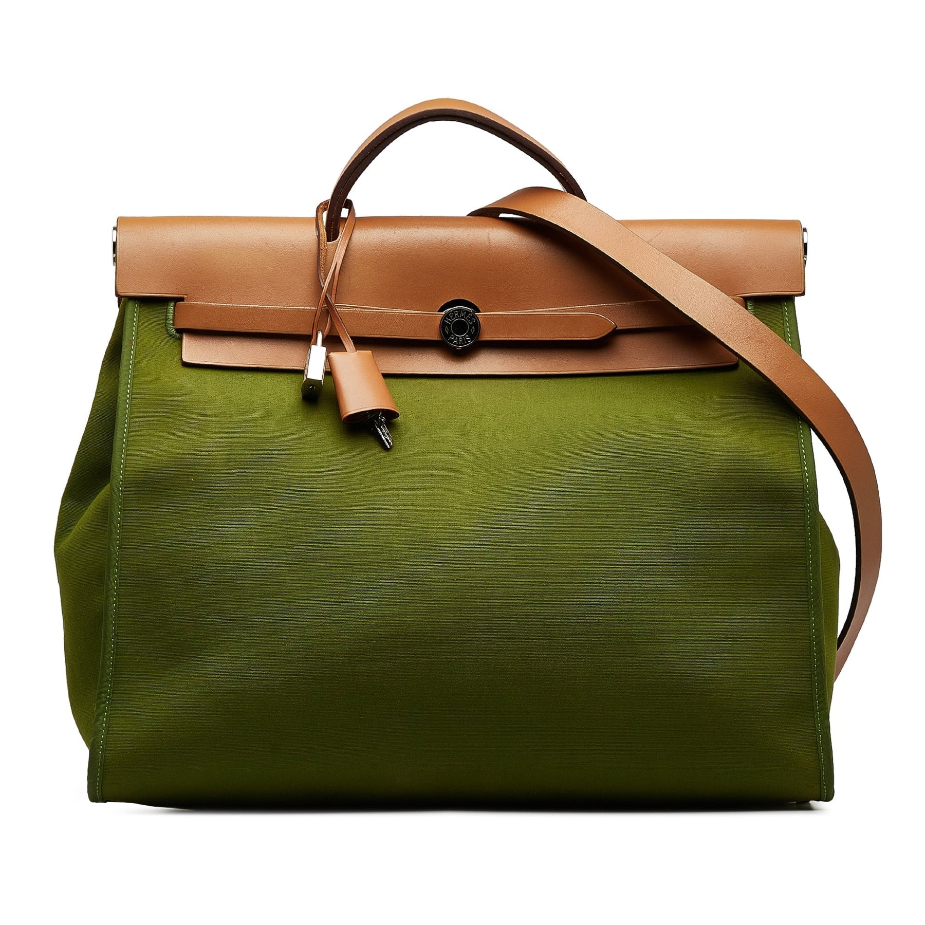 The Herbag features a canvas body, a top leather handle, a detachable strap, and a front flap with pull-through strap closure.