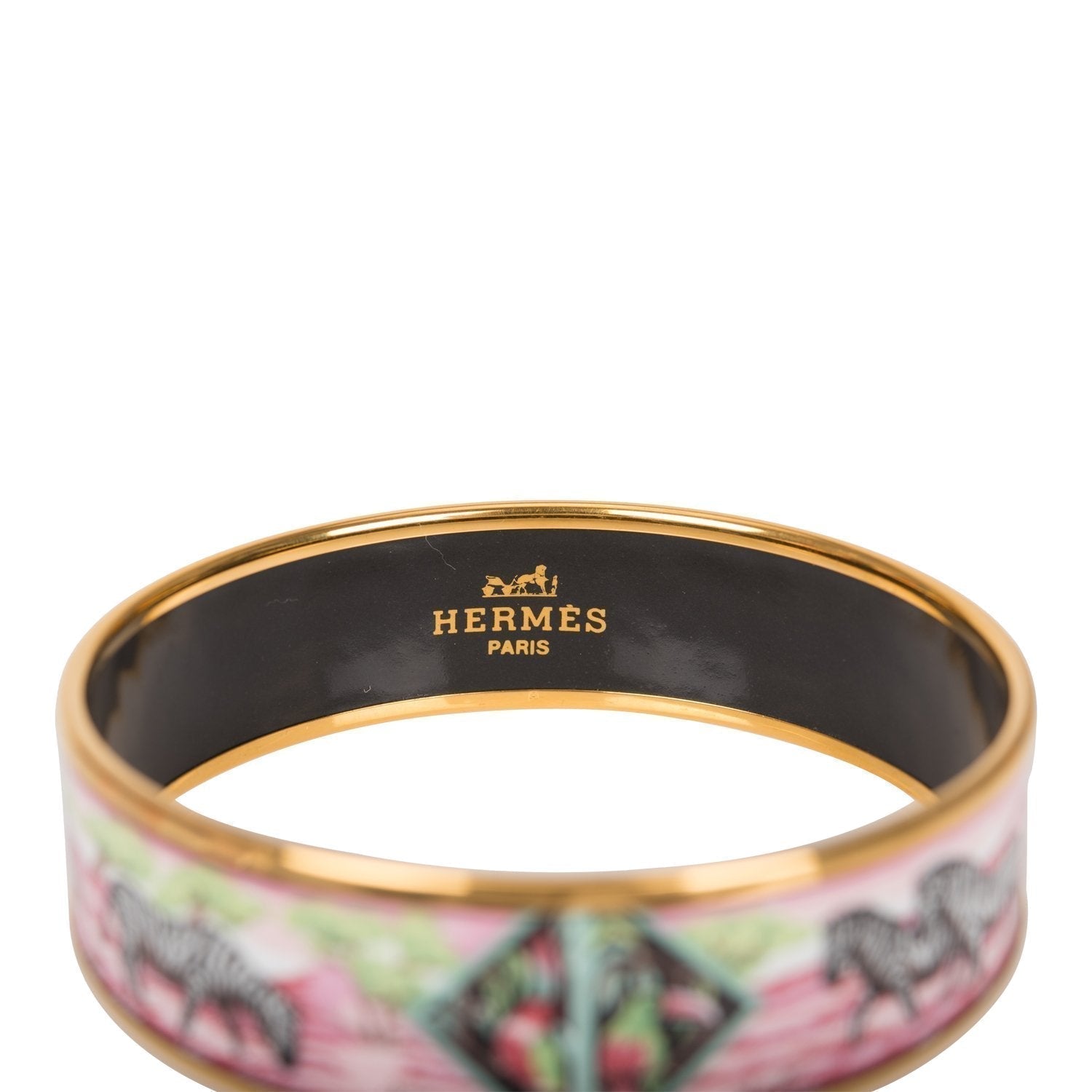 This bracelet is in printed enamel with gold plated hardware.