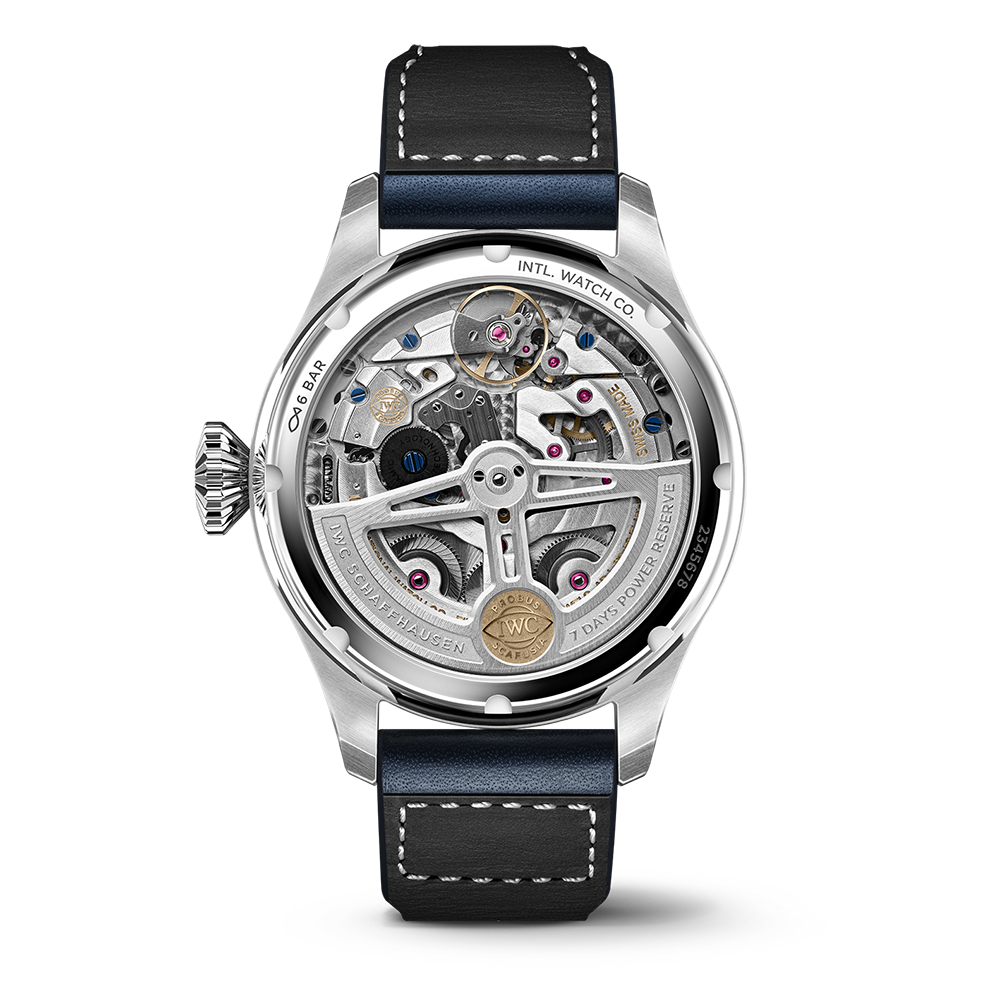 No other complication has taken centre stage on the dial of the Big Pilot’s Watch more often than the perpetual calendar. Developed during the 1980s by IWC’s former head-watchmaker Kurt Klaus, the large dial not only lends itself well to the mechanism’s many display, but it also makes reading of the calendar information particularly easy. The Big Pilot's Watch Perpetual Calendar features a stainless steel case, a blue dial, rhodium-plated hands and a blue calfskin strap. The perpetual calendar automatically recognizes the different month lengths and the leap years, and will not require a manual adjustment until 2100. Engineered from only about 80 individual parts, the calendar module is driven by a single nightly switching pulse from the IWC-manufactured 52615 calibre. Components of the Pellaton winding system that are subject to severe stresses are made of virtually wear-free ceramic. When fully wound, the two barrels store a power reserve of seven days. The elaborately decorated manufacture movement is visible through the sapphire glass back.