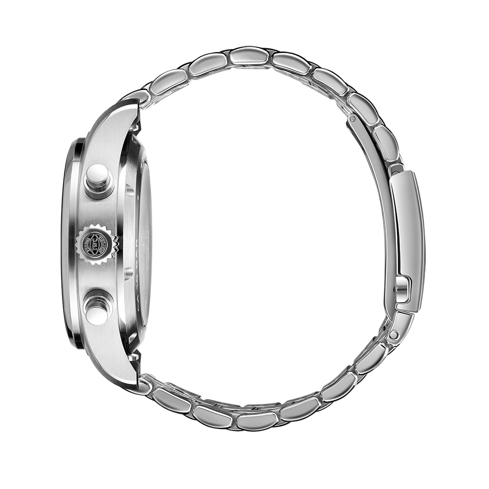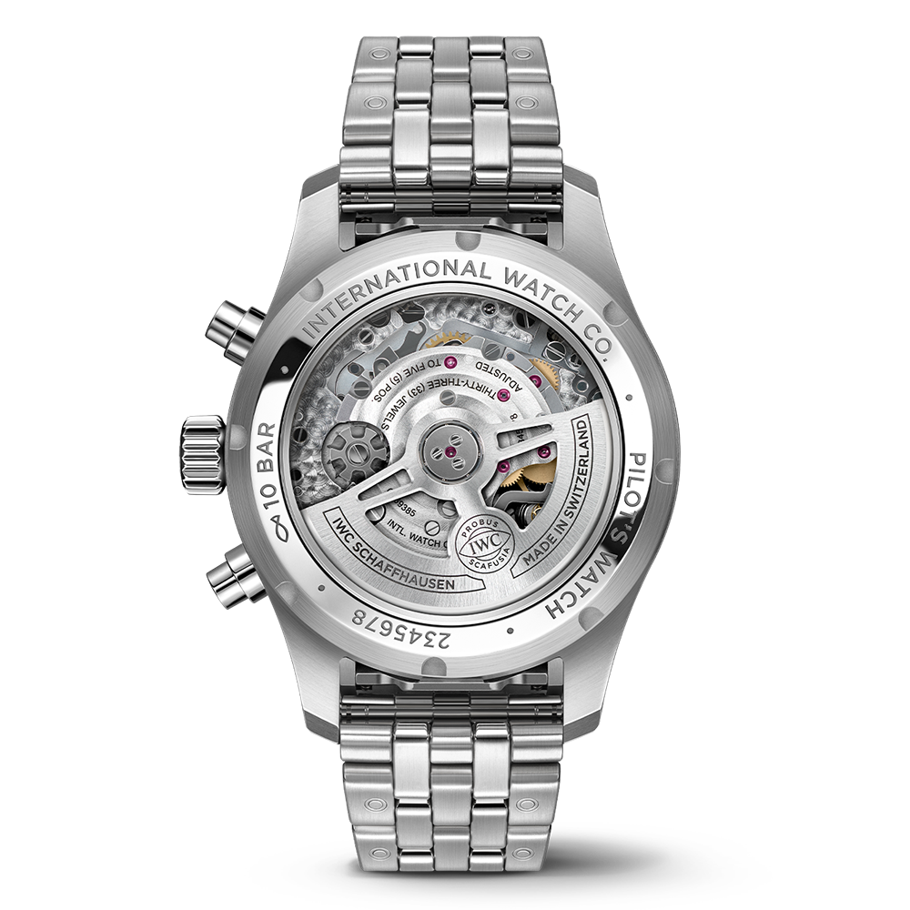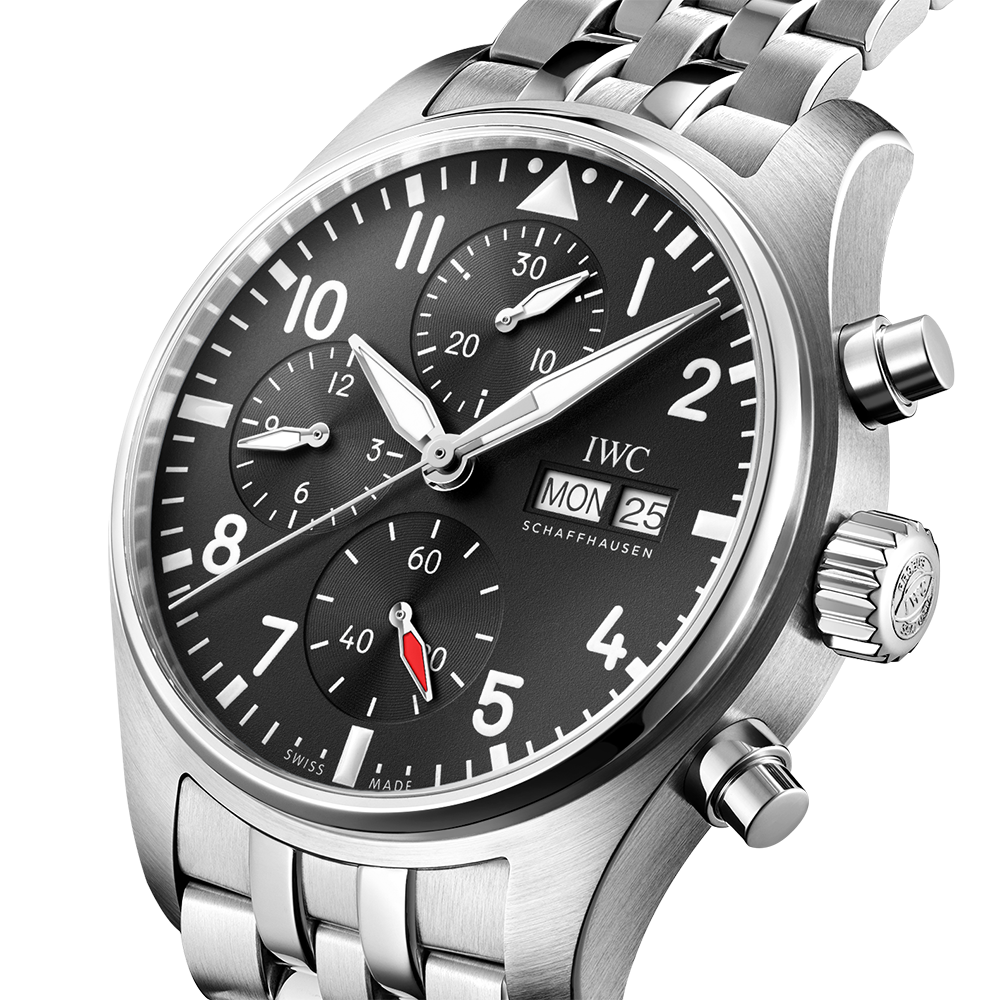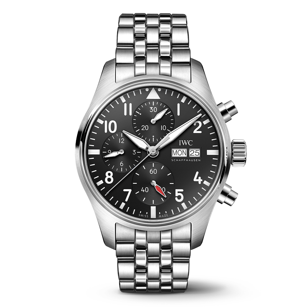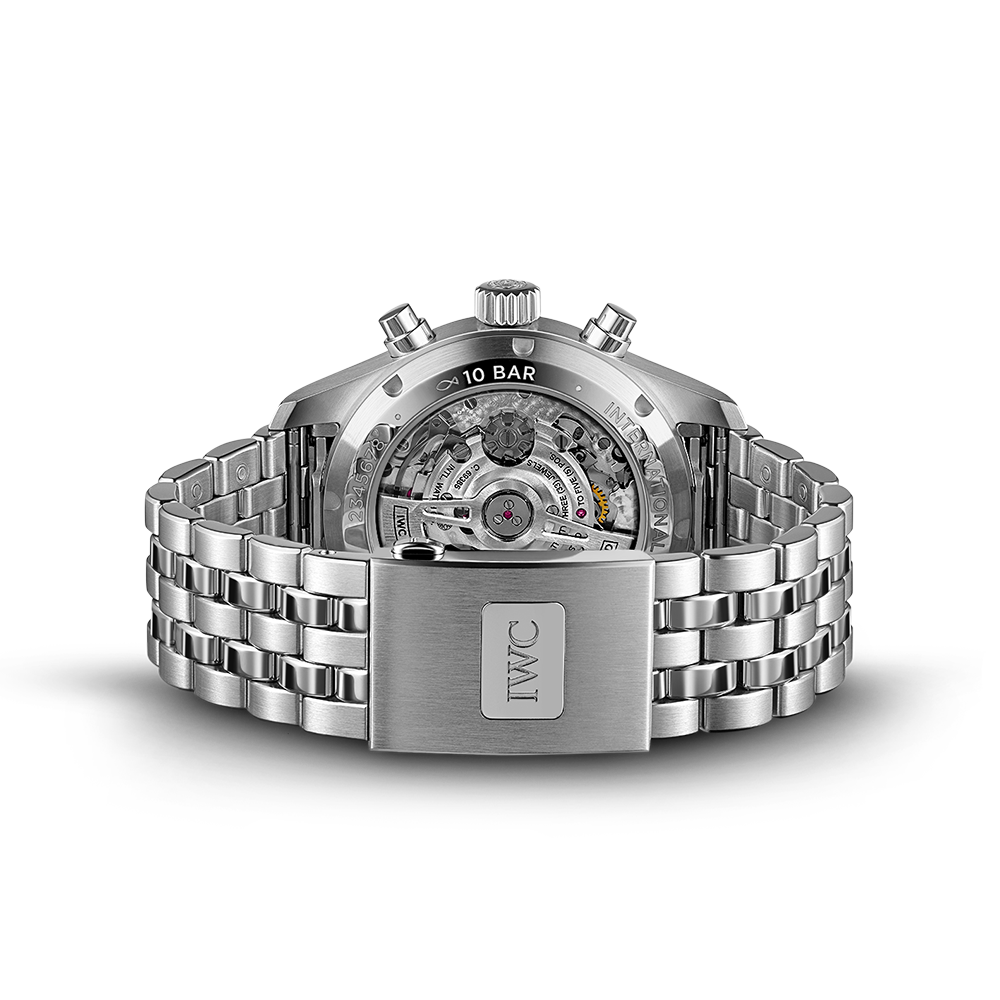Since 1994, chronographs have been a mainstay in IWC’s Pilot’s Watches collection. The dial layout with various counters not only emphasises the distinctive instrument look; the mechanical stopwatch function also offers virtually unlimited applications in everyday life. The Pilot’s Watch Chronograph 41 in an ergonomic 41-millimetre case size is powered by the IWC-manufactured 69385 calibre. The robust and precise chronograph movement with a column wheel can be observed through the sapphire glass back. This stainless steel model comes with a black dial, rhodium-plated hands and a high-quality stainless steel bracelet with fine adjustment clasp and a tapered shape. The integrated EasX-CHANGE® system allows the strap to be changed in no time at all. Also available are calfskin or rubber straps in various colours. In combination with the 10 bar water-resistant case, this versatility makes the chronograph the perfect companion for every adventure – not just in the cockpit.