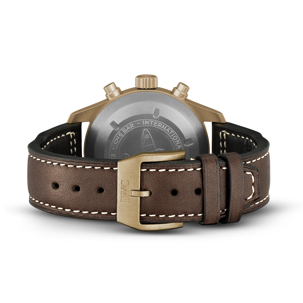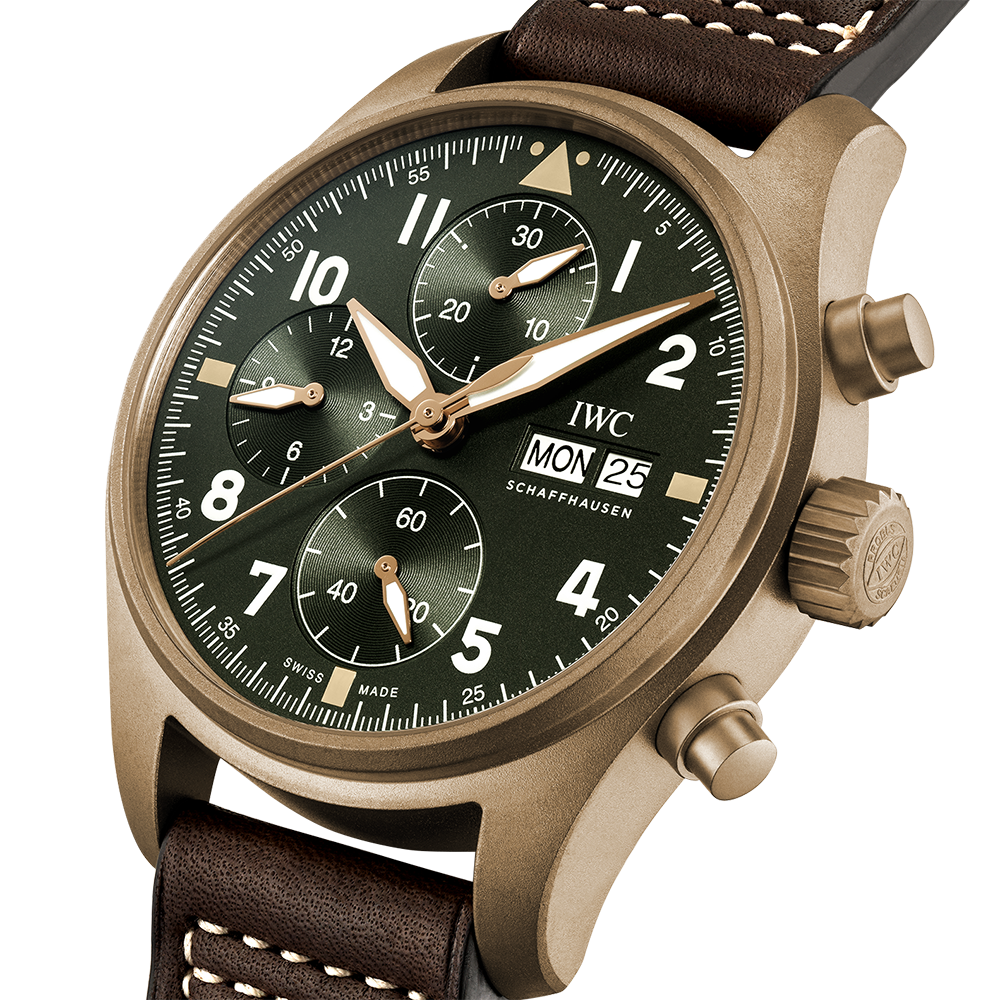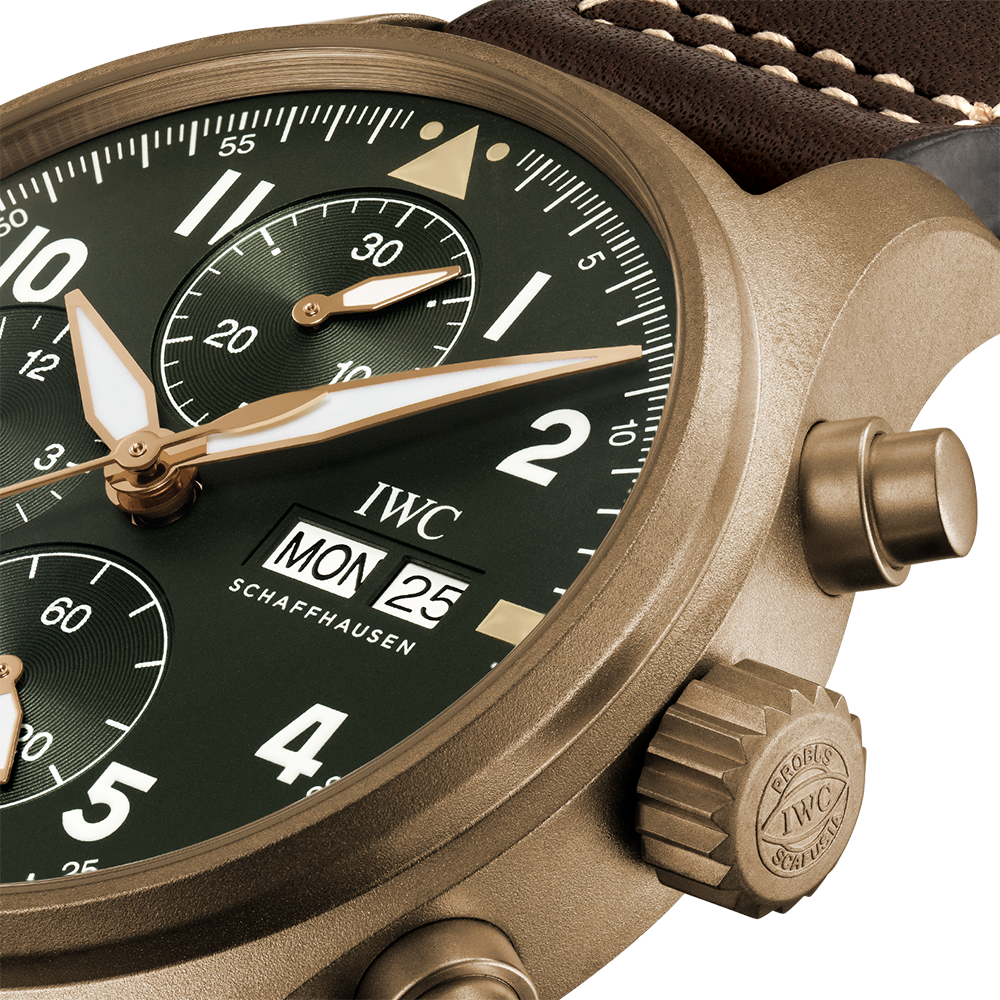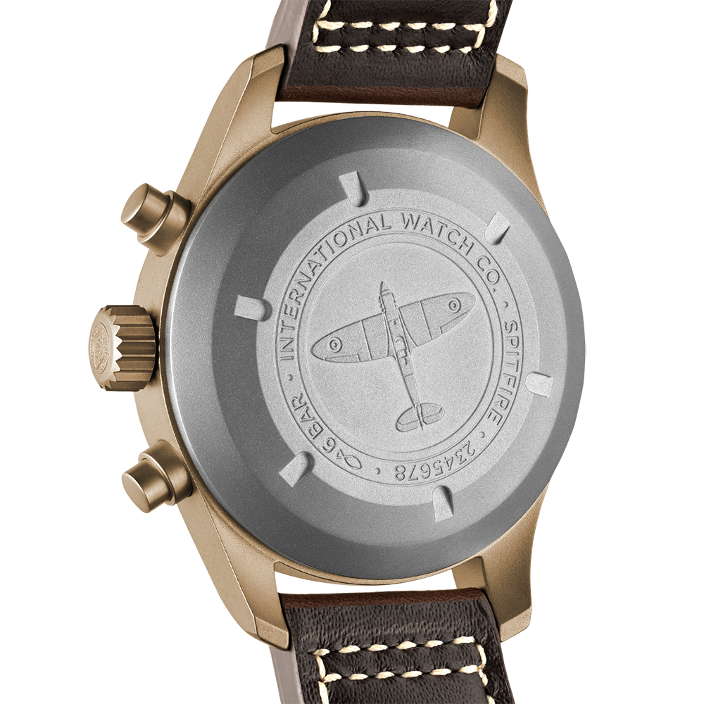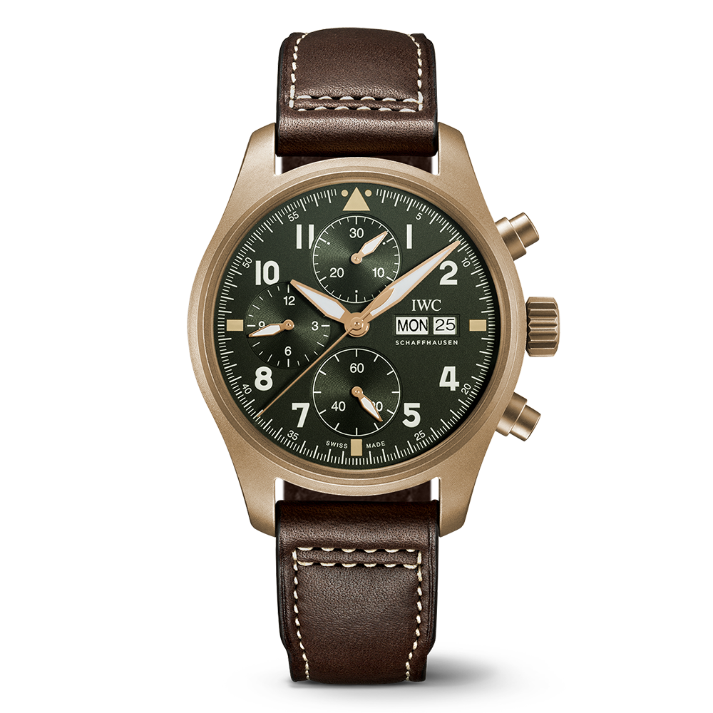 For the first time ever, IWC presents a Pilot's Chronograph with a movement from the 69000-calibre family, housed in a reduced case size with a diameter of 41 millimetres. The IWC-manufactured 69380 calibre is a rugged chronograph movement with a classic column wheel design. It displays stopped hours and minutes in two subdials at "9 o'clock" and "12 o'clock". The bidirectional pawl-winding system builds up a power reserve of 46 hours. This chronograph with a bronze case, an olive green dial and a brown calfskin strap has a unique character. Depending on the use to which it is put, bronze develops a patina in the course of time and darkens in colour, giving the Pilot’s Watch Chronograph Spitfire its own unmistakable character. A soft-iron inner case effectively shields the movement from magnetic fields.