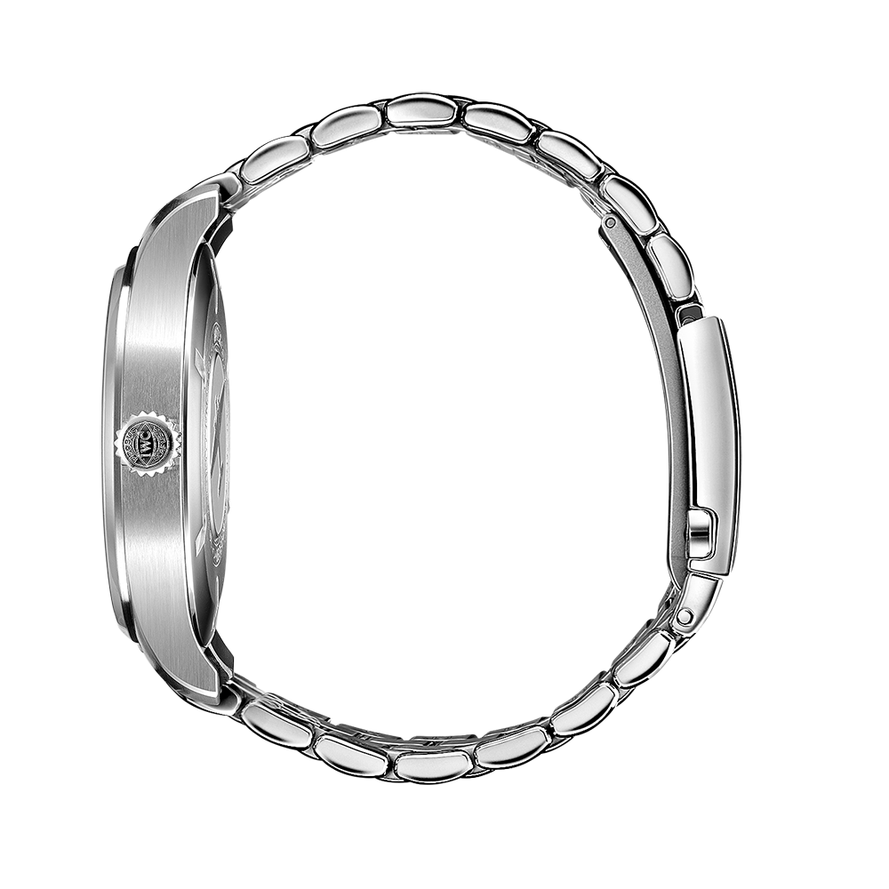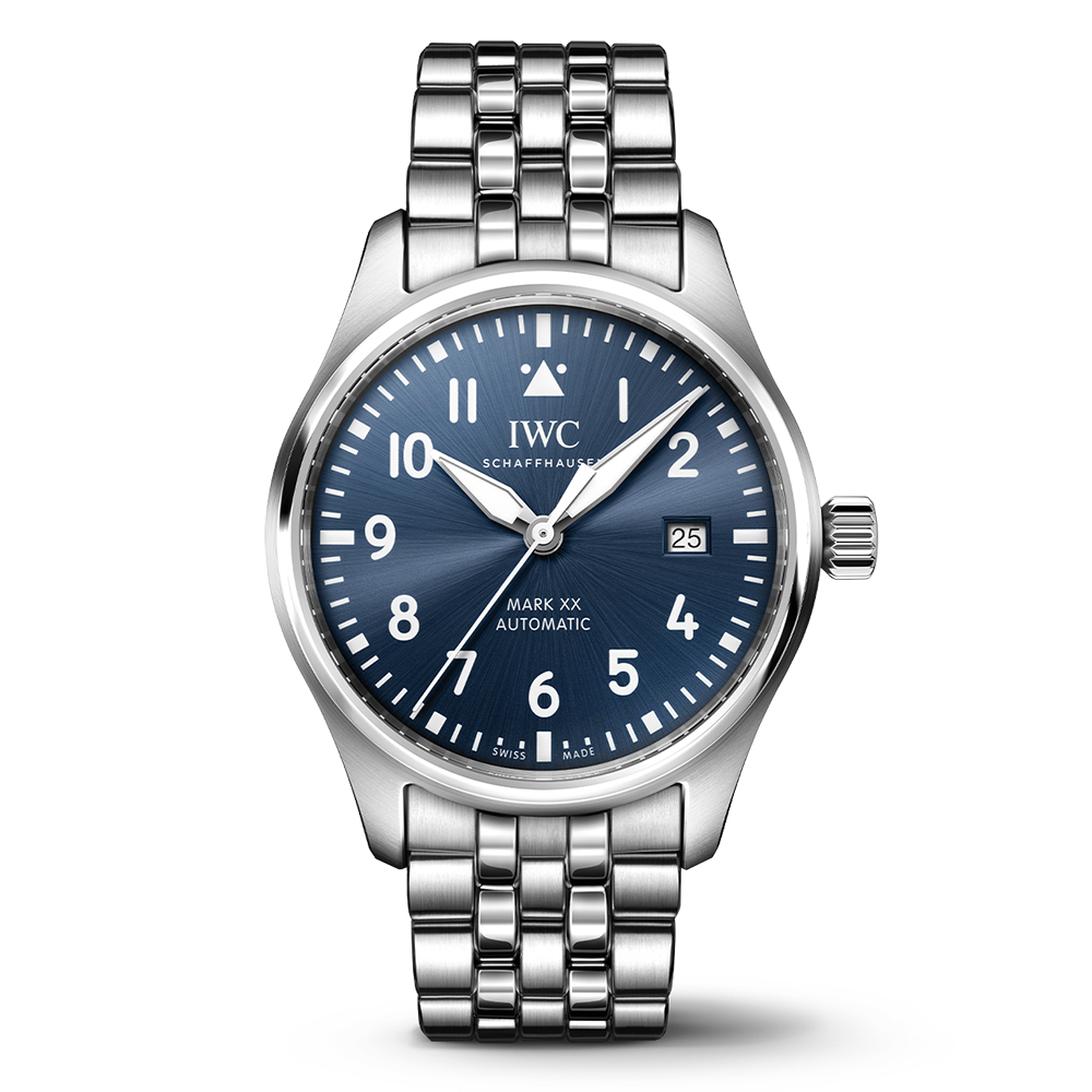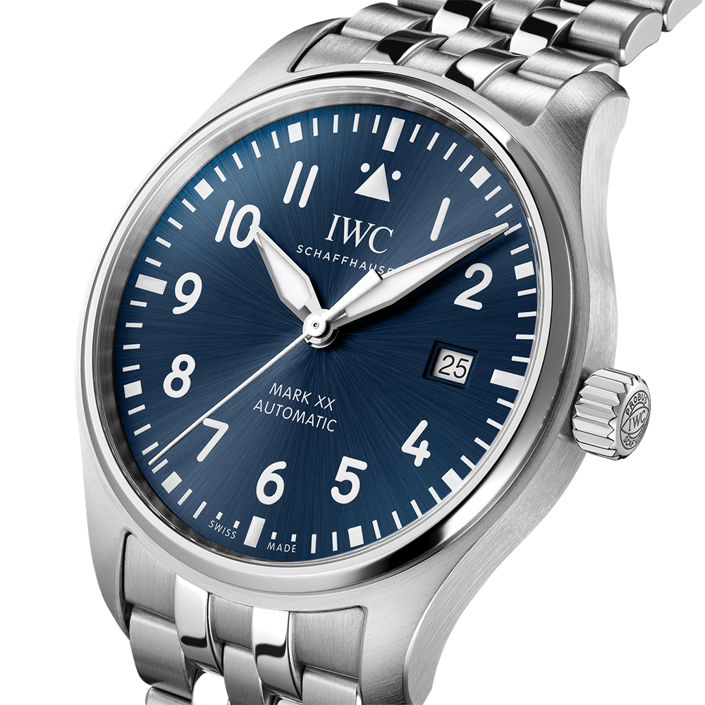 Less is more: the Mark XX reduces the design and technical functionality of a pilot's watch to its pure essence. It is the successor to the legendary Mark 11, a precise amagnetic instrument watch IWC developed in 1948 for the navigators and pilots of the British Royal Air Force. This version features a robust and corrosion-resistant stainless steel case with a diameter of 40 millimeters, a blue dial, and rhodium-plated hands. The high-contrast dial with white numerals and indices, the triangular index at 12 o'clock, and luminous elements ensure easy readability in all lighting conditions. Precision is ensured by the IWC-manufactured 32111 caliber with automatic winding and a power reserve of 120 hours. The front glass is specially secured so that it cannot detach from its place even in the event of a sudden pressure drop. The Pilot's Watch Mark XX is water-resistant to 10 bar and is fitted on a 5-link stainless steel bracelet. Thanks to the integrated EasX-CHANGE® system, the bracelet can be easily exchanged for another without additional tools.