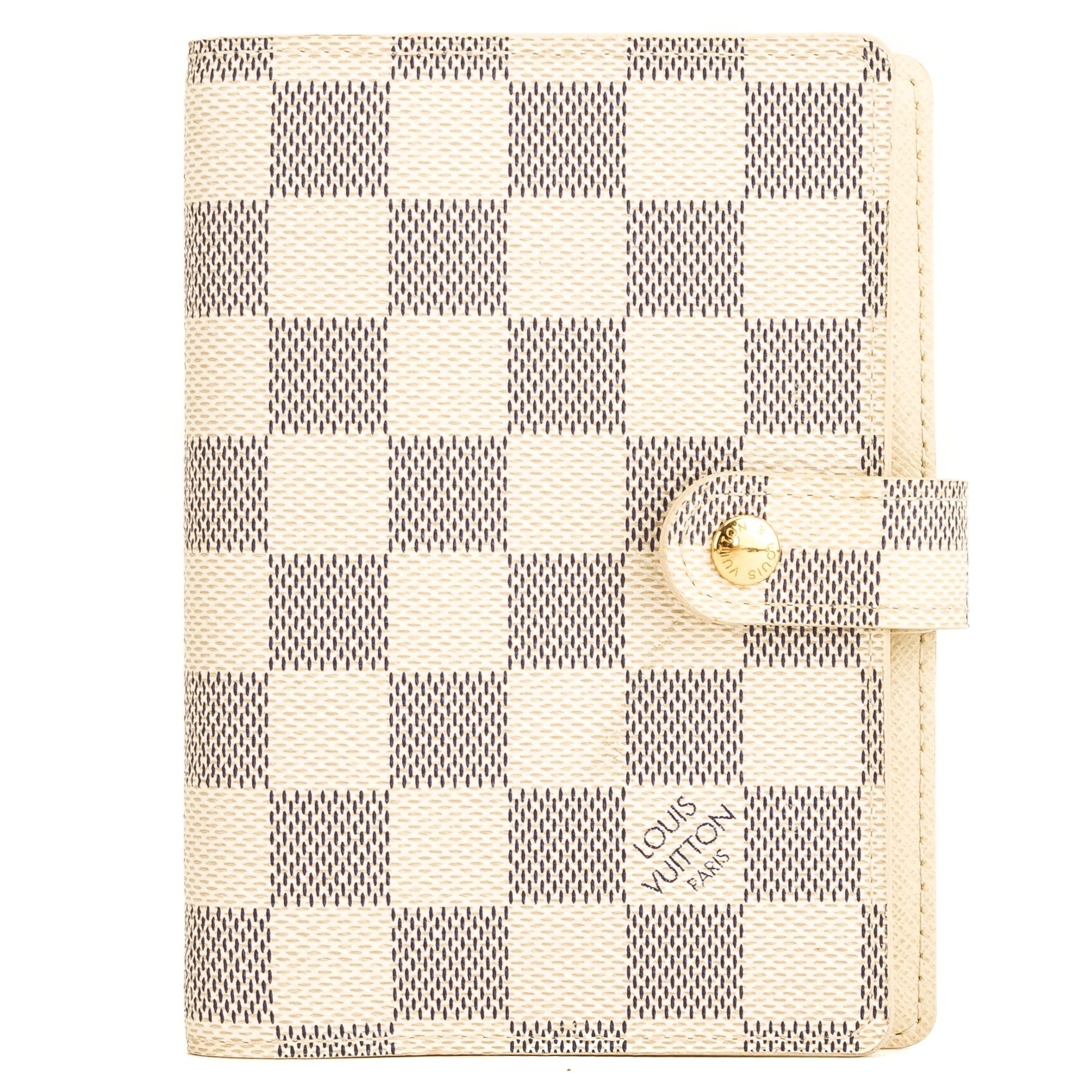 This is an authentic, pre-owned LOUIS VUITTTON Agenda PM Cover. This is the perfect luxury item to add your LV collection. It features the Damier Azur canvas with a cross-grain leather interior. This small agenda cover has three card slots, two side pockets, a gold-tone six ring binder, a pen holder, and a tab snap closure.