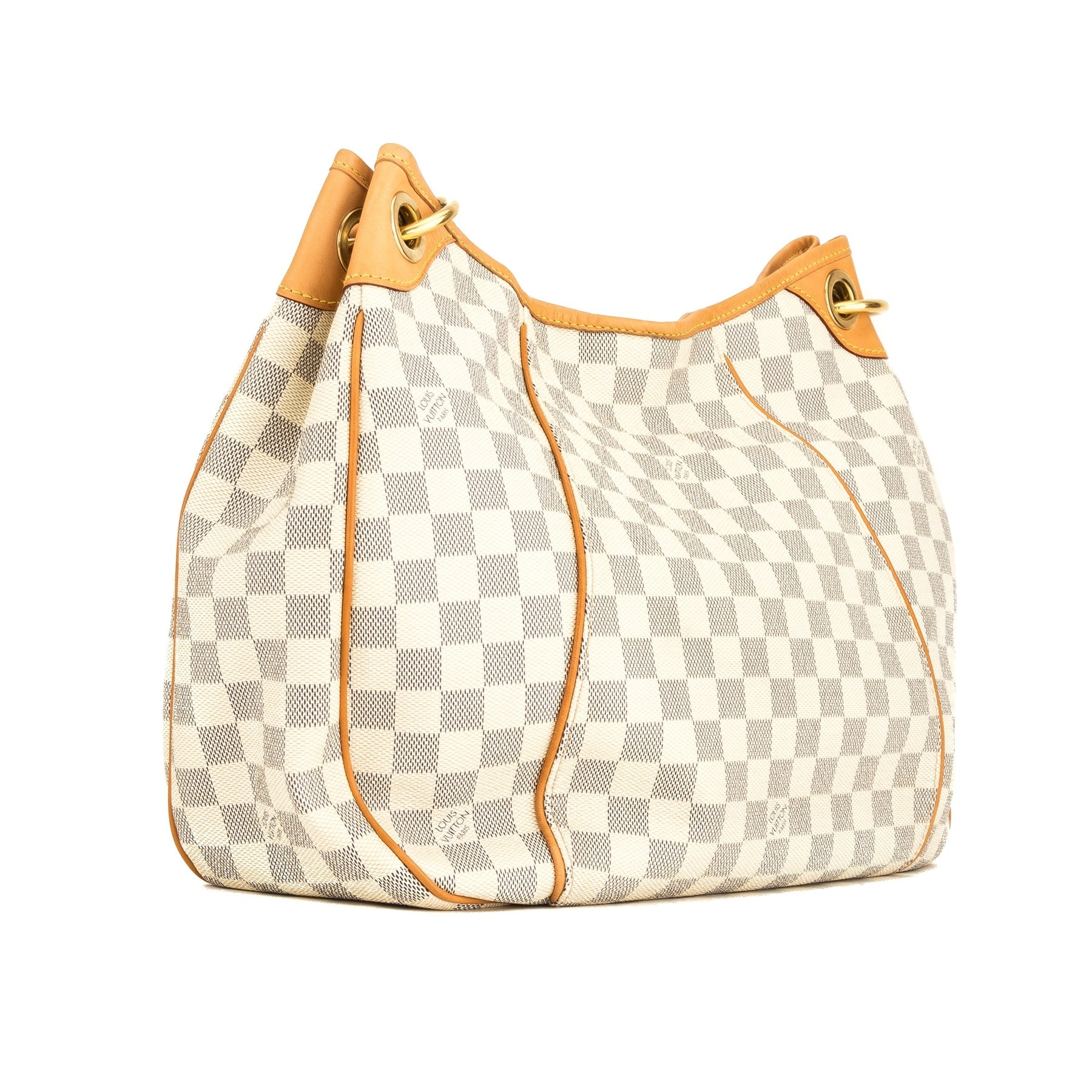 This is an authentic, pre-owned LOUIS VUITTON Galliera PM Bag. It features the Damier Azur canvas with a vachetta leather trim, details, and gold-tone hardware with an LV Inventuer plate on the front. It has a wide adjustable handle for carrying support and four feet on the base. It has a roomy interior with a beige alcantara lining, a cellphone pocket, an open pocket, a snap pocket, and a magnetic snap closure. It's a great handbag for every day.