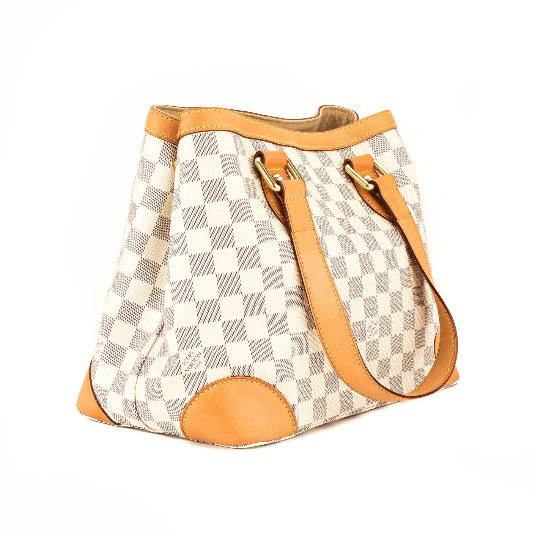 This is an authentic, pre-owned LOUIS VUITTON Hampstead PM Bag. Its petite size is practical for every day with a look of elegance. It features the Damier Azur canvas with shiny gold-tone hardware and an LV Inventeur plate on the front. It has a vachetta leather trim, flat handles, and base corners. The interior is spacious with a alcantara lining, an open pocket, a cellphone pocket, a zip pocket, and a hook closure.
