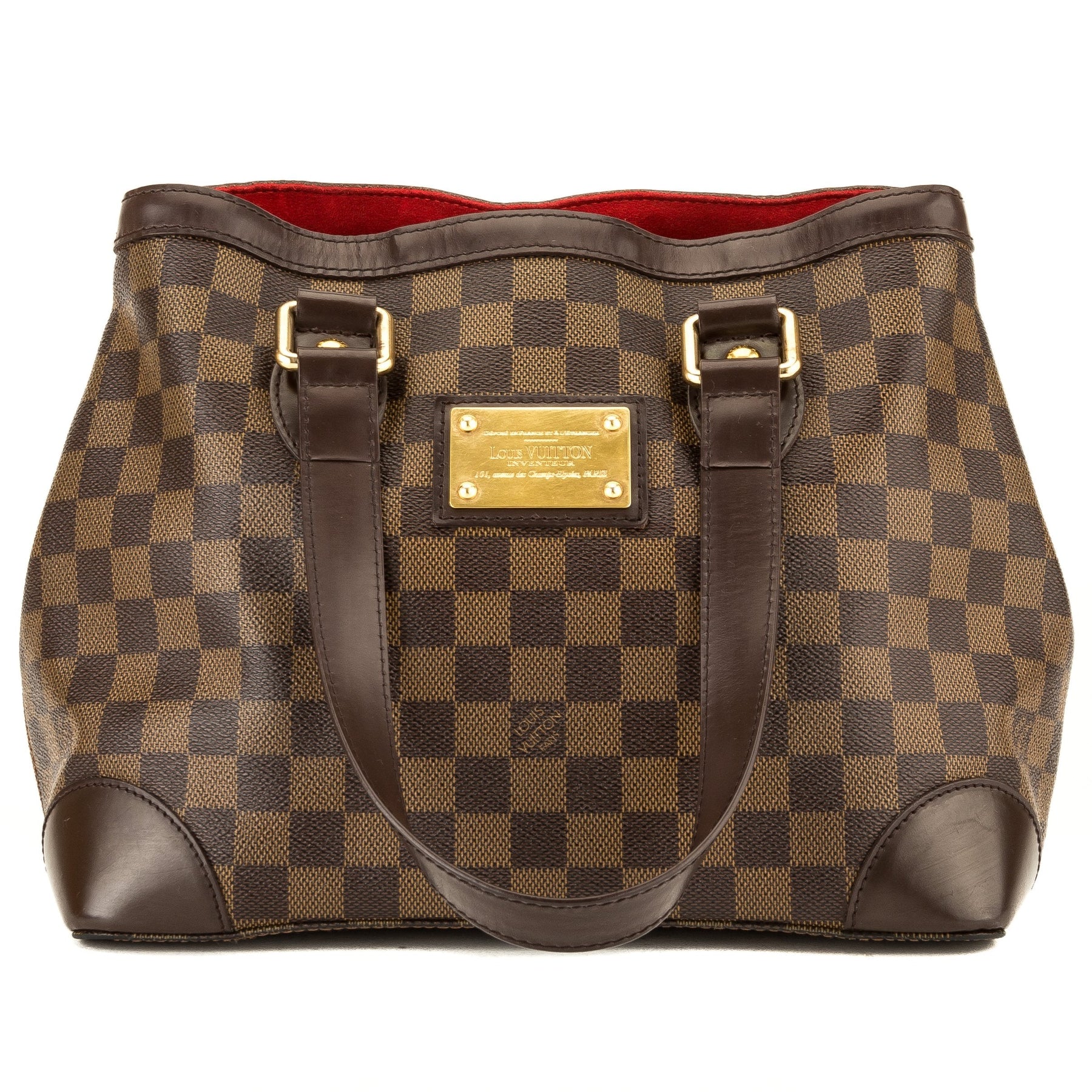 This is an authentic, pre-owned LOUIS VUITTON Hampstead PM Bag. Its petite size is practical for every day with a look of elegance. It features the Damier Azur canvas with shiny gold-tone hardware and an LV Inventeur plate on the front. It has a vachetta leather trim, flat handles, and base corners. The interior is spacious with a alcantara lining, an open pocket, a cellphone pocket, a zip pocket, and a hook closure.
