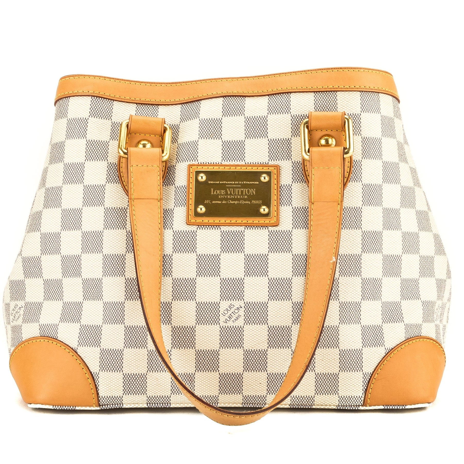 This is an authentic, pre-owned LOUIS VUITTON Hampstead PM Bag. Its petite size is practical for every day with a look of elegance. It features the Damier Azur canvas with shiny gold-tone hardware and an LV Inventeur plate on the front. It has a vachetta leather trim, flat handles, and base corners. The interior is spacious with a alcantara lining, an open pocket, a cellphone pocket, a zip pocket, and a hook closure.