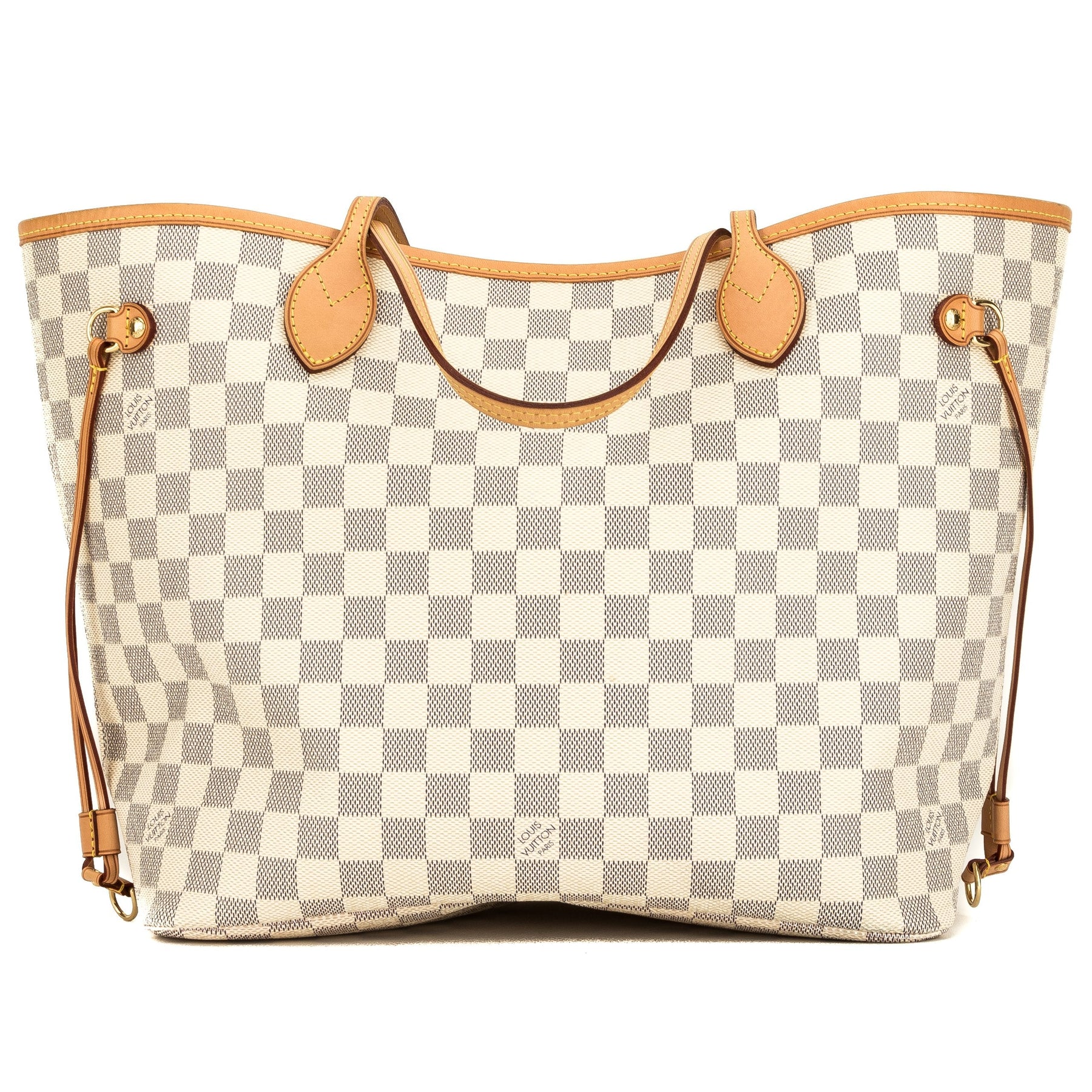 This is an authentic, pre-owned LOUIS VUITTON Neverfull MM Bag. This is the widely popular Neverfull in a size medium (MM). It features the alluring Damier Azur canvas with a vachetta leather trim, side drawstrings to change the capacity of the bag, slim leather handles, and gold-tone hardware. The interior has a striped textile lining with Louis Vuitton archive details, a zip pocket, a d-ring, and a hook closure. This is a charming and sophisticated handbag for every day.