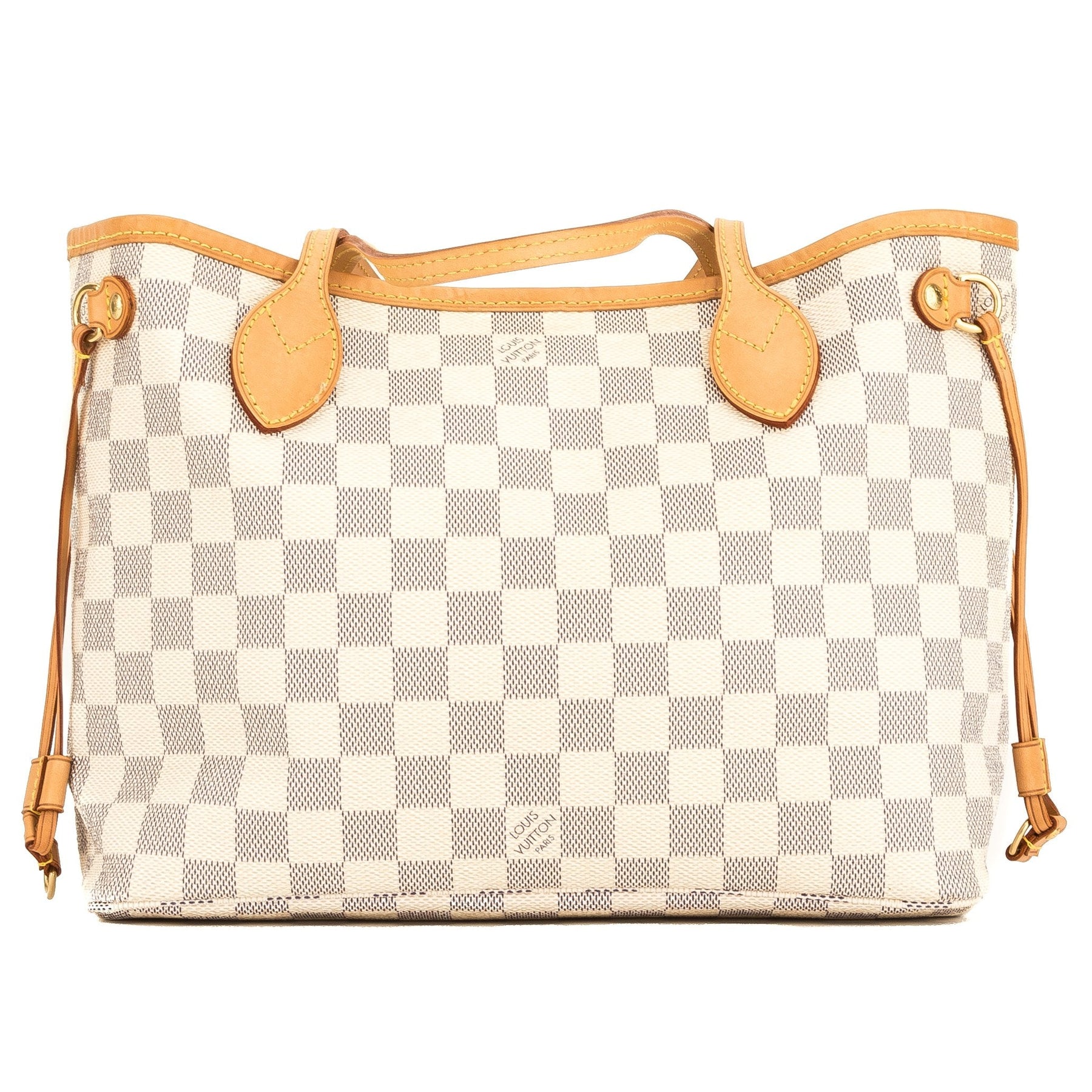 This is an authentic, pre-owned LOUIS VUITTON Neverfull PM Bag. It's a classic and popular Neverfull in the petite size (PM). It features the beautiful Damier Azur canvas with a vachetta leather trim, side drawstrings to change the capacity of the bag, and slim leather handles. Inside, it has a striped textile lining with Louis Vuitton archive details, a zip pocket, a d-ring, and a hook closure. The gold-tone pieces enhance the elegance of the bag. This is a charming and sophisticated handbag for every day.