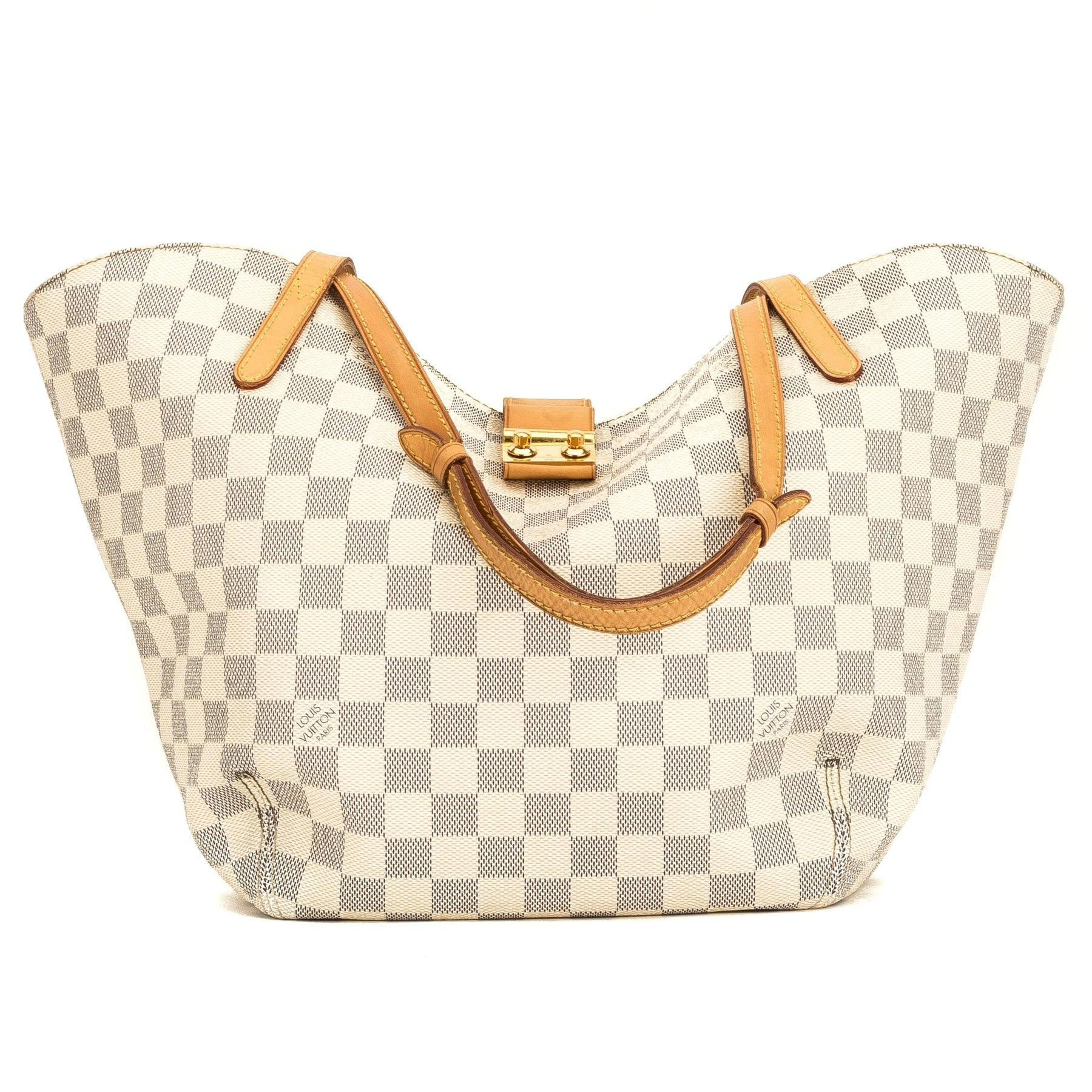 This is an authentic, pre-owned LOUIS VUITTON Salina PM Bag. This beautiful handbag is crafted in the Damier Azur canvas. It has vachetta leather details with long handles, shoulder pads, a cross-over tab with press-lock closure, and golden metallic hardware. The interior has a soft beige microfiber lining with a zip pocket and three flat pockets. Carry all your daily essentials in this spacious handbag.