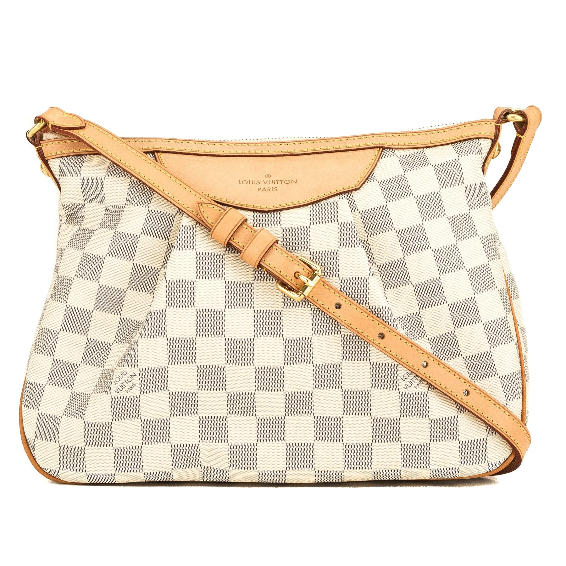 This is an authentic, pre-owned LOUIS VUITTON Siracusa PM Bag. It's for the woman with exceptional style. It's named after the historic city, Siracusa, in southern Italy. It's a beautiful handbag made in the Damier Azur canvas with a vachetta leather trim, an adjustable shoulder strap, and gold-tone hardware. It has a spacious interior with a beige textile lining, two open pockets, and a zip closure. It's a great bag for every day!