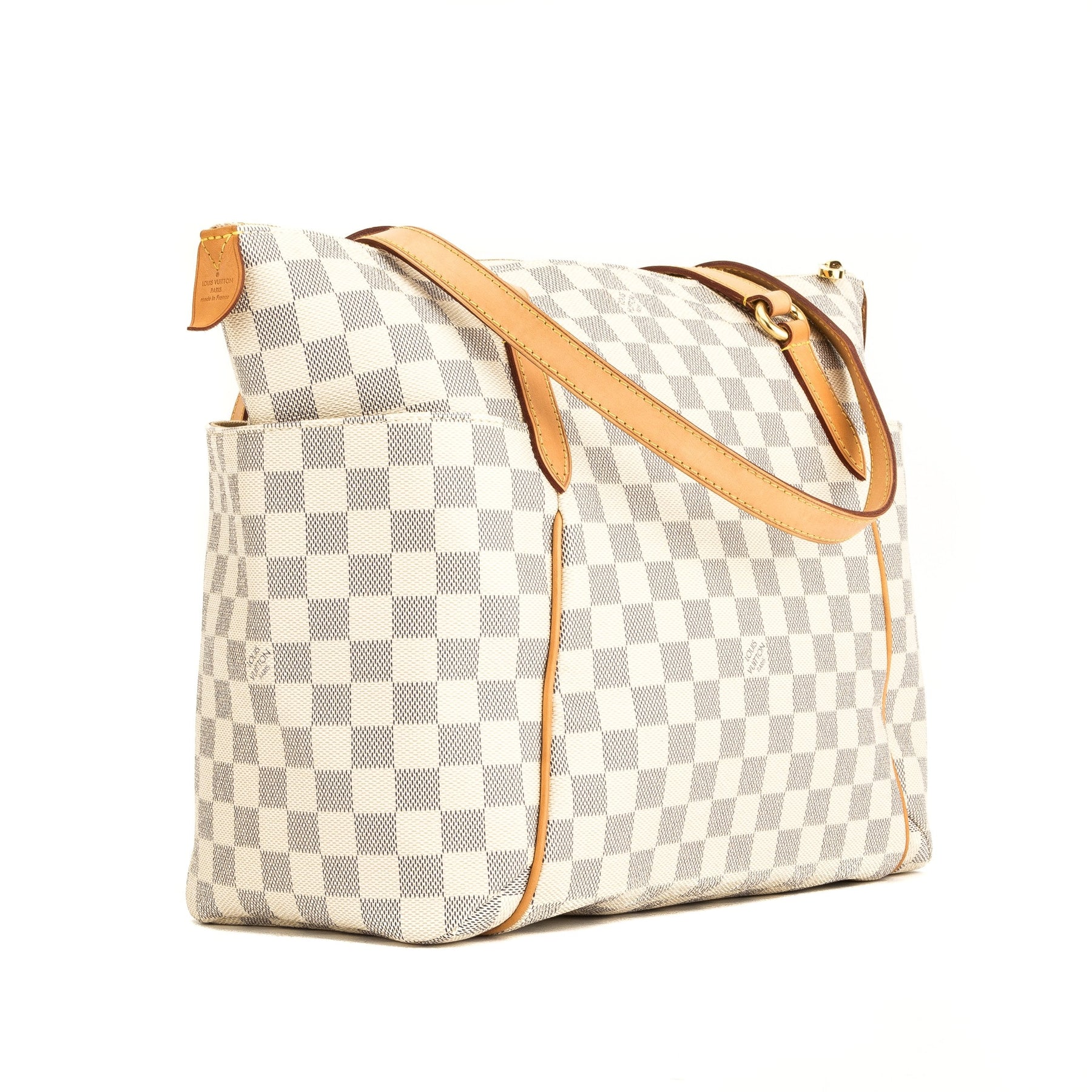 This is an authentic, pre-owned LOUIS VUITTON Totally MM Bag. It's a beautiful LV tote for every day! This is the medium-sized handbag. It features the Damier Azur canvas with two open side pockets and vachetta leather straps and trim. It has a spacious textile-lined interior with three open pockets to place your phone and smaller necessities - not to mention a shiny golden brass zip closure and accents that add an extra touch of luxury.