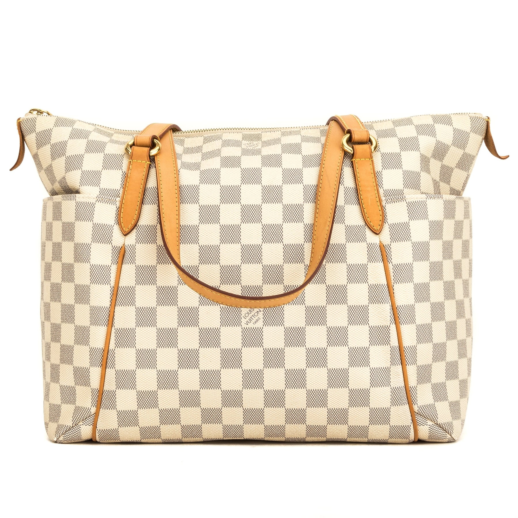 This is an authentic, pre-owned LOUIS VUITTON Totally MM Bag. It's a beautiful LV tote for every day! This is the medium-sized handbag. It features the Damier Azur canvas with two open side pockets and vachetta leather straps and trim. It has a spacious textile-lined interior with three open pockets to place your phone and smaller necessities - not to mention a shiny golden brass zip closure and accents that add an extra touch of luxury.
