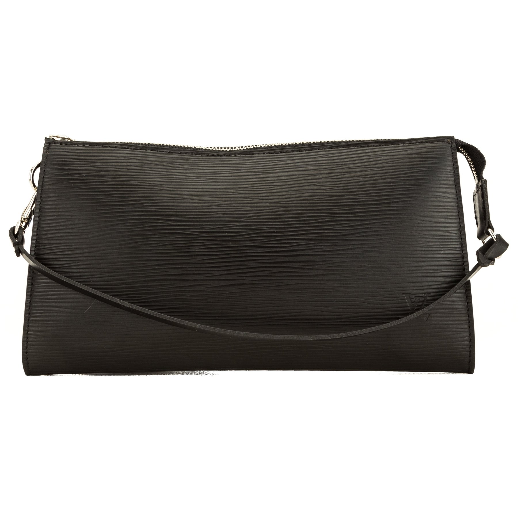 This is an authentic, pre-owned LOUIS VUITTON Pochette Accessoires 24 Bag in the black Epi leather. It's a stylish bag for any occasion. It has a detachable leather strap for to carry as a shoulder bag or a clutch and golden brass hardware. It's spacious enough to hold your small necessities with a black suede lining and a zip closure with pull.