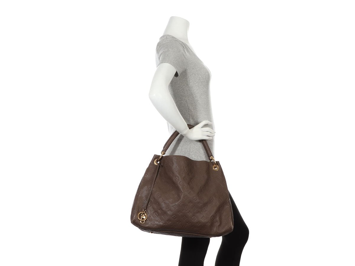 Louis Vuitton’s Ombre Empreinte Artsy MM is slouchy, embossed logo leather with a ton of room and even more wow factor! An open topped tote, it’s lined in brown striped fabric with one zipped and six slide pockets inside, as well as a clasp and keychain attached to the 3.75-inch drop to the strap that can be tucked inside the bag and pulled out for easy access. In good condition with a dustbag and info booklet, the corners and top edges are rubbed, the gold hardware is scratched, there are a few faint white marks (mainly on the bottom and sides), a few stains inside, and it has a musty smell. It’s an unstructured look with a laid-back attitude!