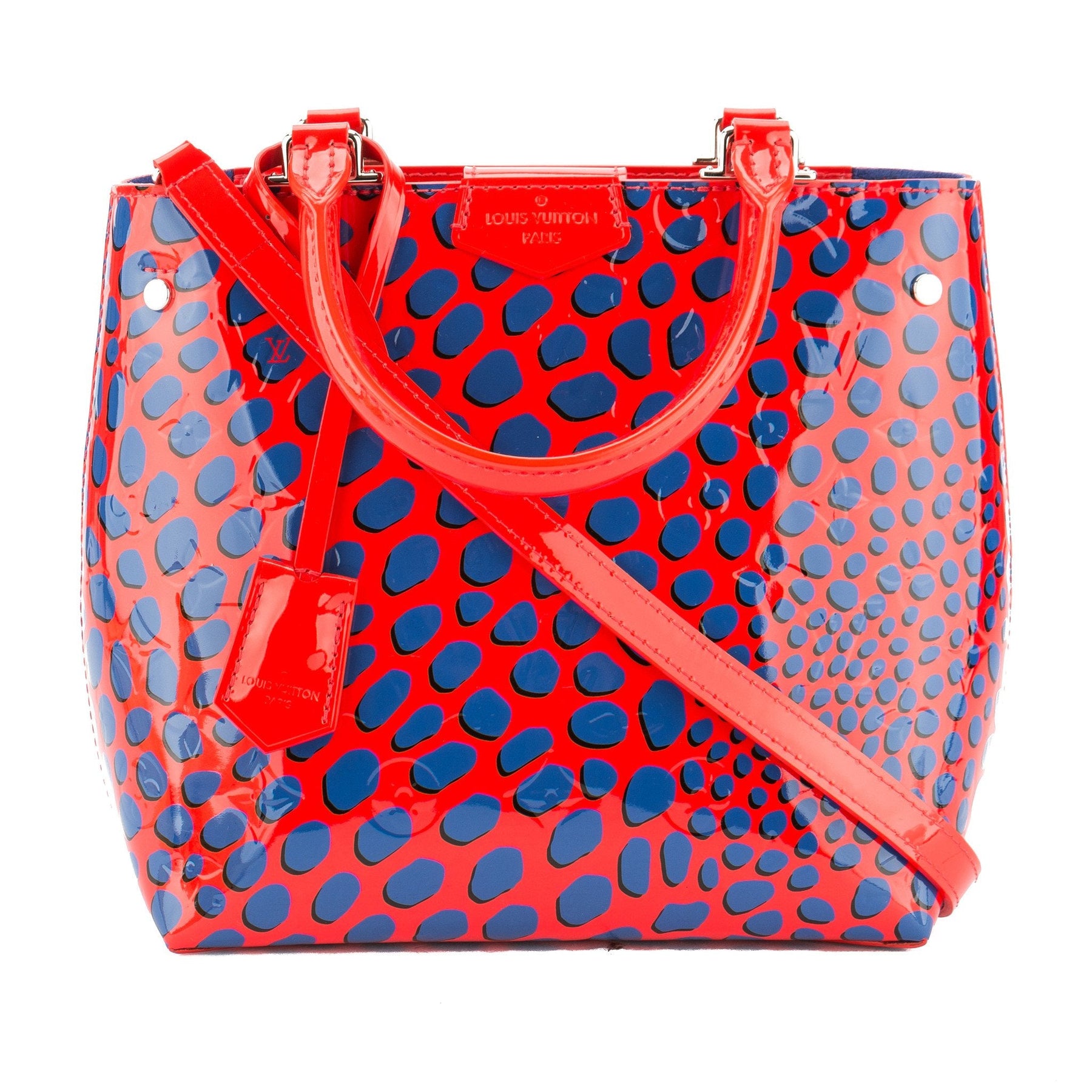 This is an authentic LOUIS VUITTON Monogram Patent Leather Open Tote Bag in Coquelicot Denim. This unique handbag is a new design from the house of Louis Vuitton. It features a red monogram patent calf leather canvas with a blue jungle dots print, two toron handles, a removable clochette, a removable shoulder strap, silver-tone hardware, and four base feet. The interior a blue microfiber lining, a zip pocket, an open pocket, and a tab magnetic snap closure. This is a trendy and stylish handbag for any occasion. Get the Open Tote today!