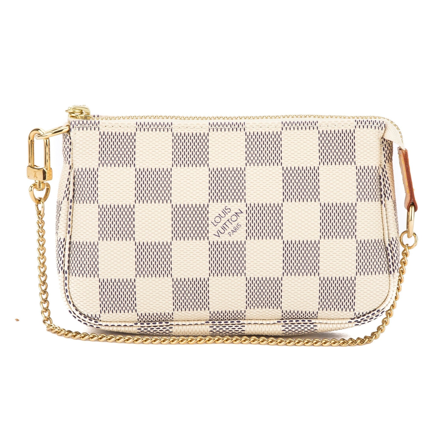 This is an authentic LOUIS VUITTON Damier Azur Mini Pochette Accessoires Bag. It's a stylish tote for all fashionistas with the luxury of Louis Vuitton. It's smaller than the original bag but has similar features - the iconic damier azur canvas with a detachable gold chain strap for wear as a tote or a clutch. The interior has a beige textile lining with a gold-tone zip closure and space for small items. It's the perfect mini handbag for every day. Add this to your collection today!