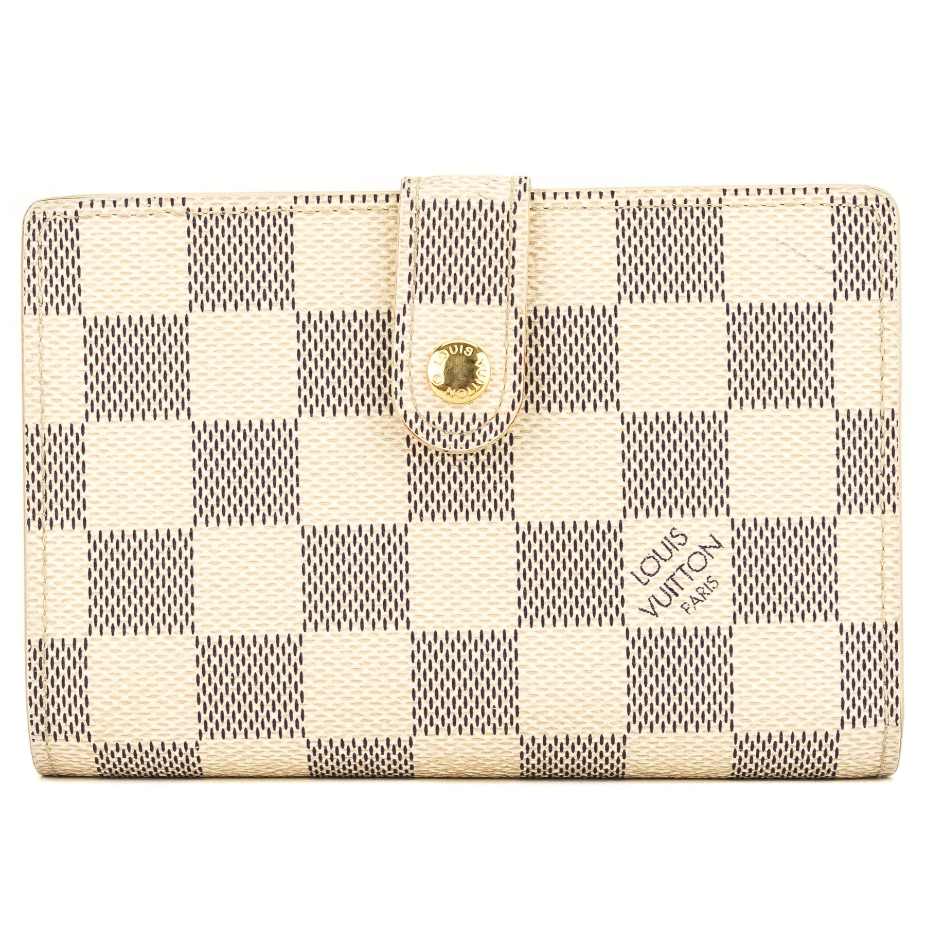 This is an authentic, pre-owned LOUIS VUITTON Porte-Monnaie Viennois Wallet. It's a compact bi-fold wallet - perfect to carry in your handbag or briefcase. It's crafted in the Damier Azur canvas with a tab snap closure and a leather-lined interior. It has four card slots, two slip pockets, a bill slot, and a coin purse with clasp closure. Organize your money in this classic Louis Vuitton wallet.