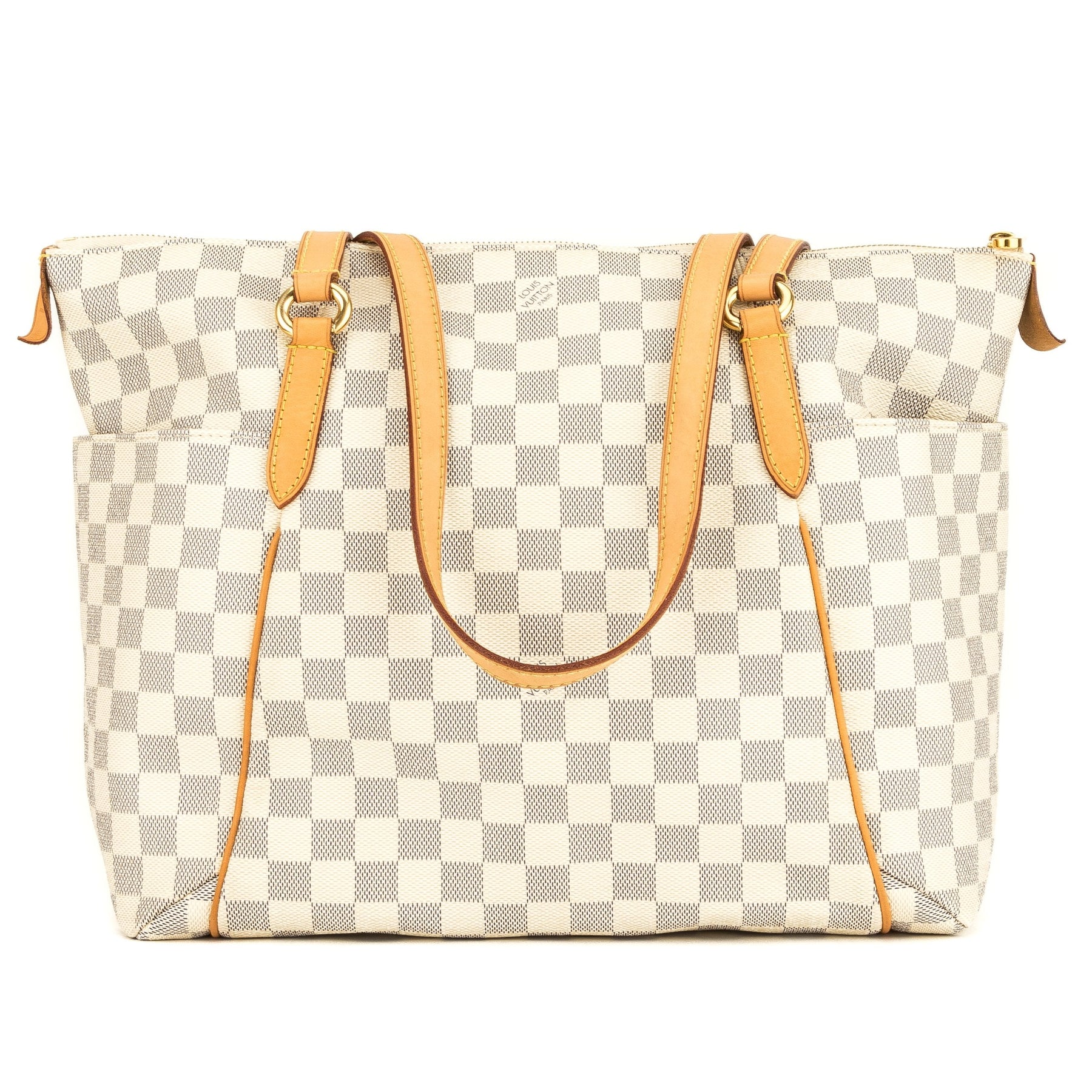This is an authentic, pre-owned LOUIS VUITTON Totally MM Bag. It's a beautiful LV tote for every day! This is the medium-sized handbag. It features the Damier Azur canvas with two open side pockets and vachetta leather straps and trim. It has a spacious textile-lined interior with three open pockets to place your phone and smaller necessities - not to mention a shiny golden brass zip closure and accents that add an extra touch of luxury.