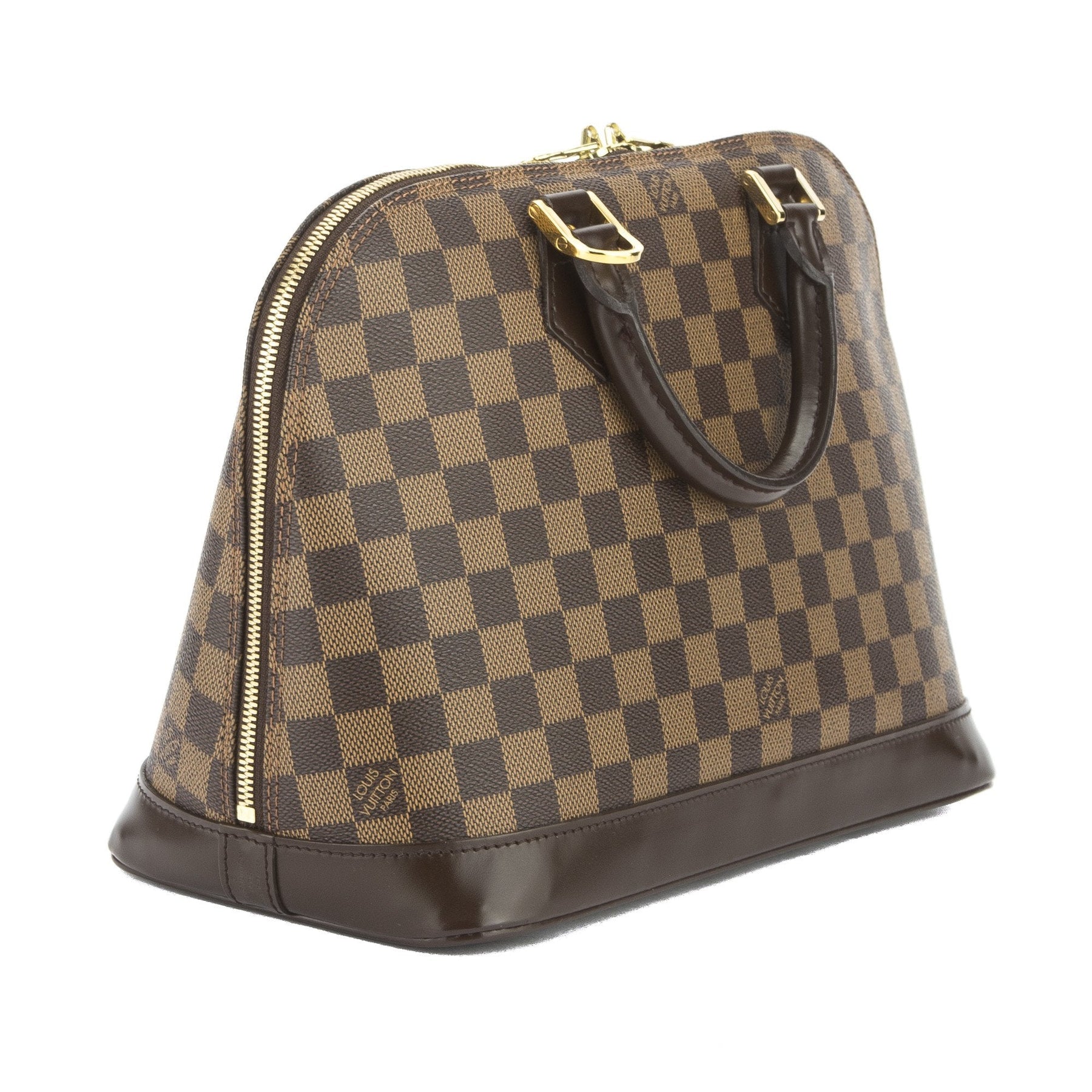 This is an authentic Louis Vuitton Damier Ebene Alma bag. Made with Damier Ebene canvas and leather trim. It features a roomy inside open compartment and gold tone hardware.