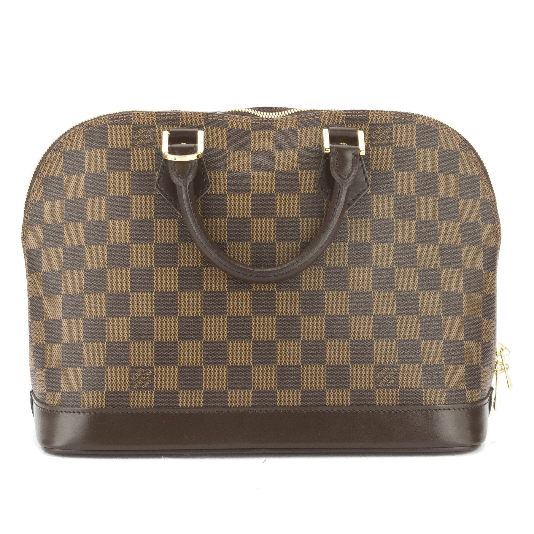 This is an authentic Louis Vuitton Damier Ebene Alma Bag. This is a very classy and sophisticated bag for any occasion. Made with the beautiful Damier Ebene canvas, It features a roomy interior with a rouge textile lining and two open pockets. It's a nice structured bag - named after the Alma Bridge in Paris. This is a must-have. Add this to your collection today!