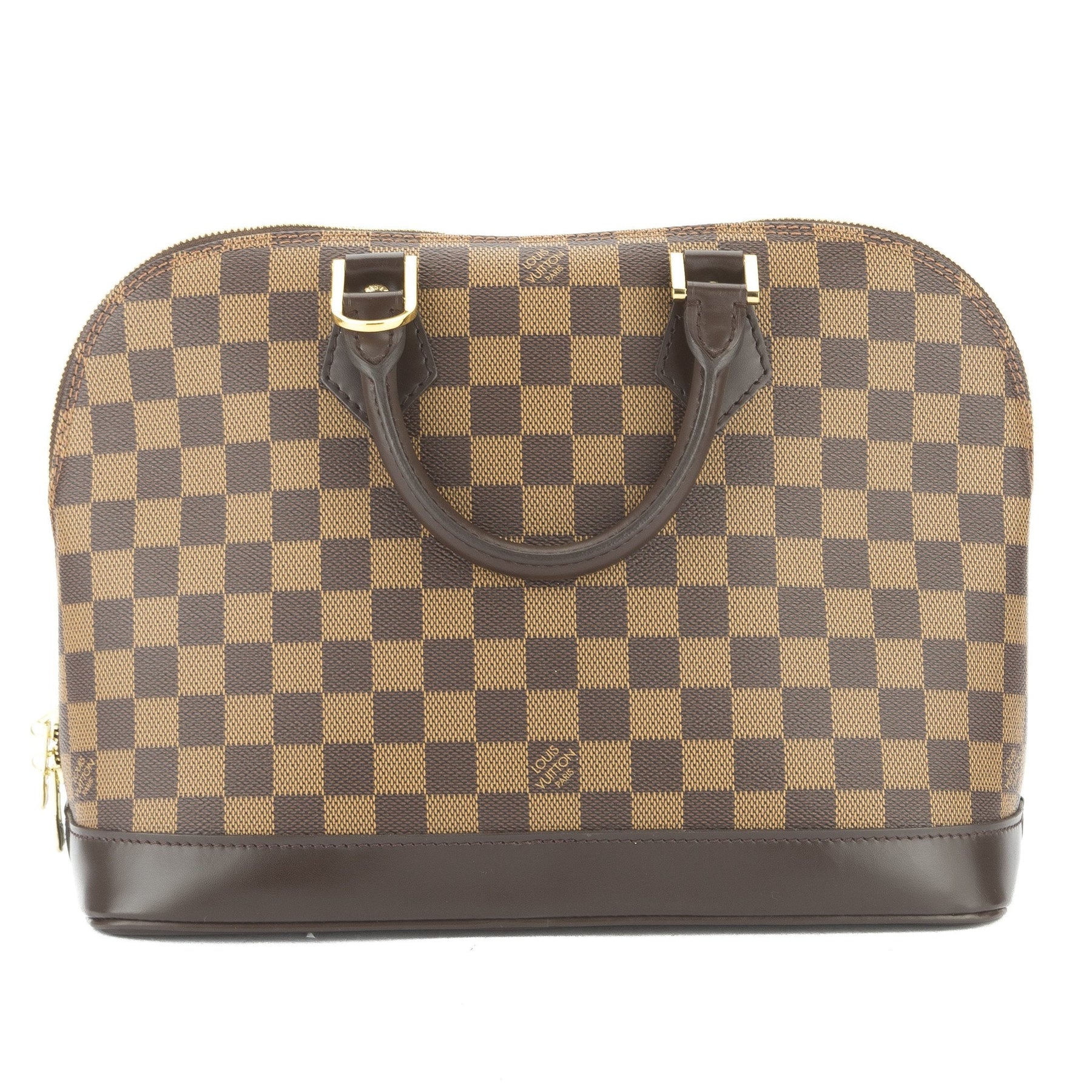 This is an authentic Louis Vuitton Damier Ebene Alma Bag. This is a very classy and sophisticated bag for any occasion. It's made with the alluring Damier Ebene canvas with a dark brown patent leather base and rolled handles. It has gold brass hardware with a double-sided zip closure that includes a lock with keys to secure your bag. It has a roomy interior with a rouge cross-grain lining, an open pocket, and a cellphone pocket. It's a nice structured bag - named after the Alma Bridge in Paris. This is a must-have. Add this to your collection today!
