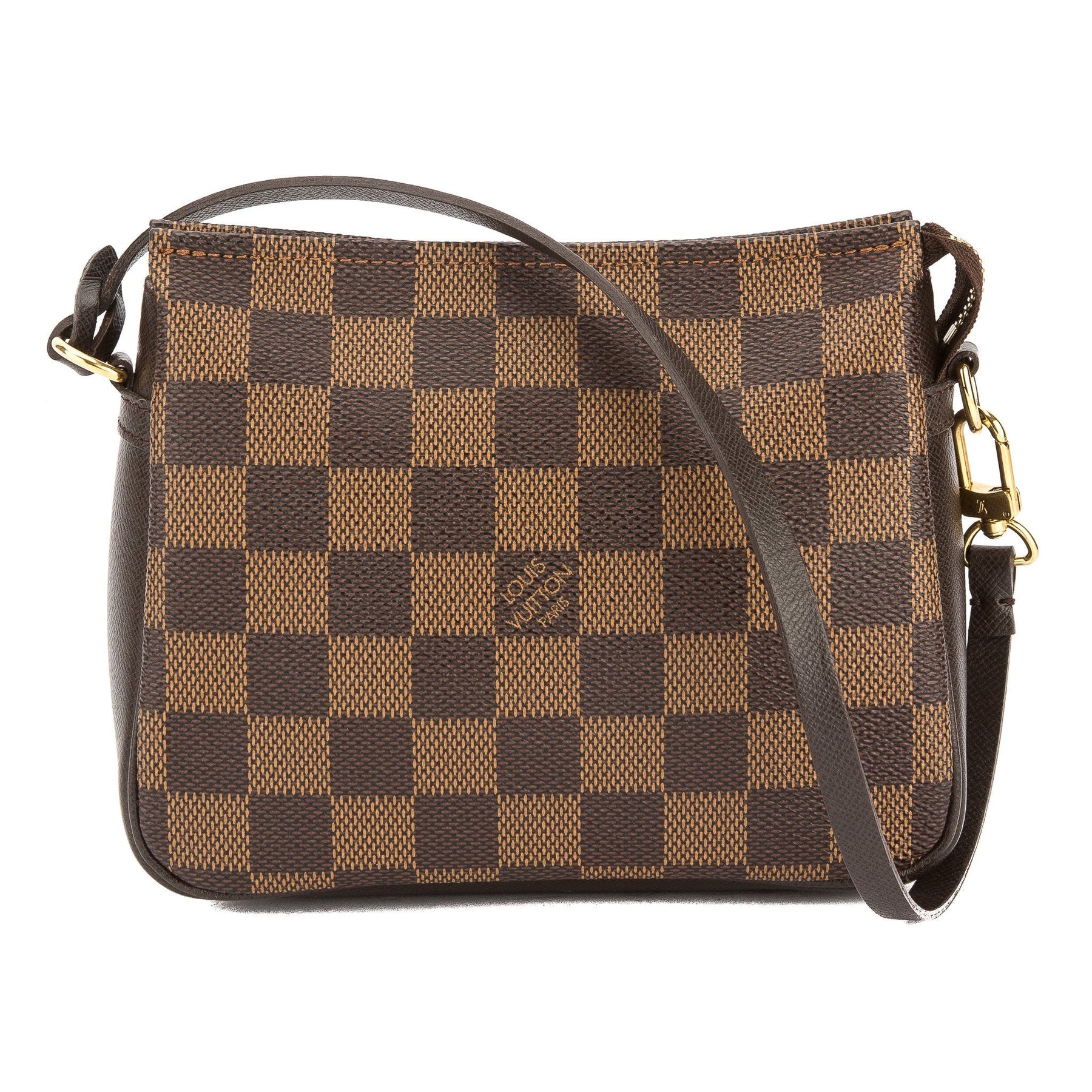 This is an authentic LOUIS VUITTON Trousse Cosmetic Tote Bag. It's the perfect travel bag for your make-up and/or accessories. It has the elegance of Louis Vuitton's Damier Ebene check canvas with dark brown leather details, a long detachable strap, and gold-tone pieces. It has a roomy interior with a red textile lining and a zip closure. Carry it as a tote, clutch, or wristlet. Keep your make-up organized where-ever your go with this sophisticated cosmetic pouch. Grab yours today!
