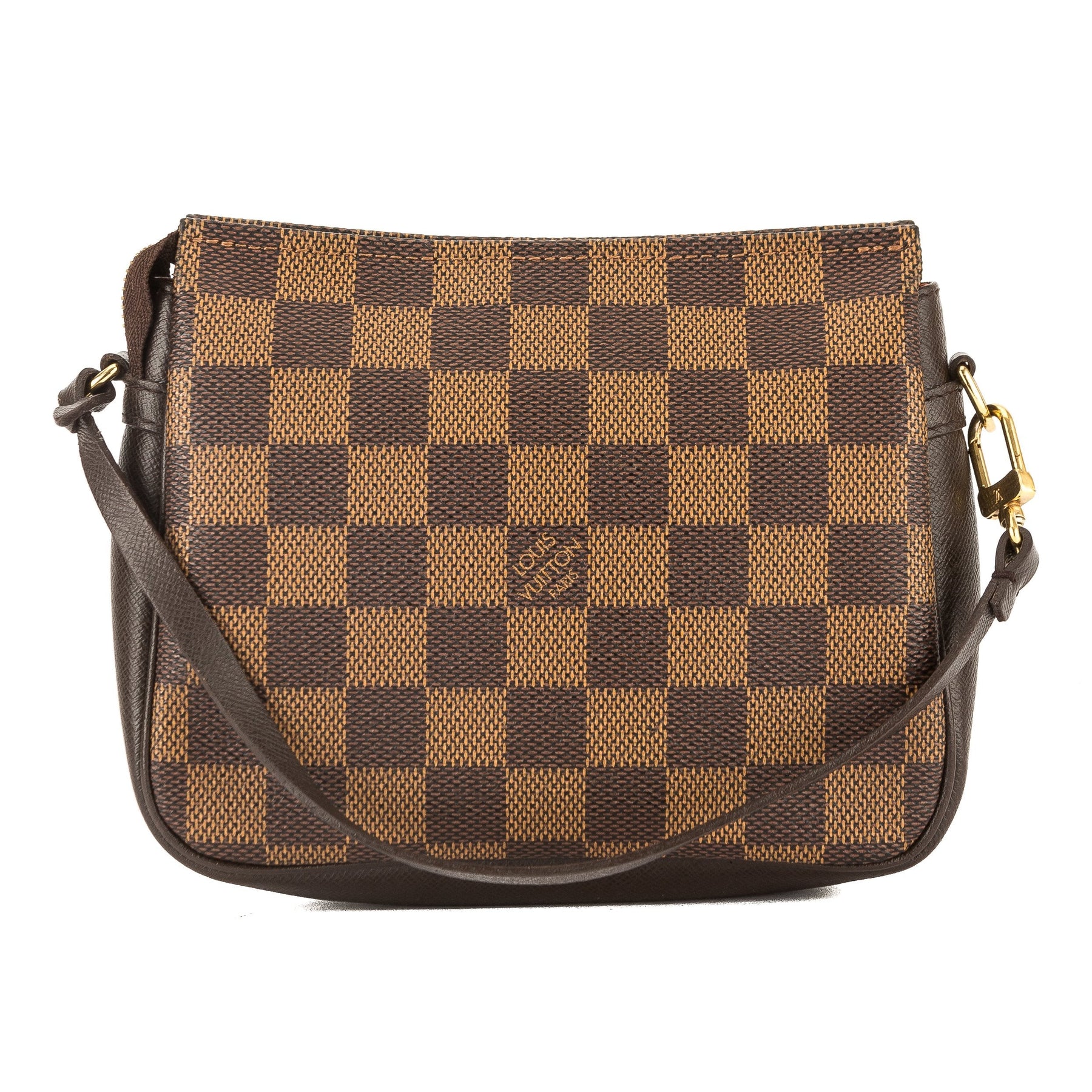 This is an authentic, pre-owned LOUIS VUITTON Trousse Cosmetic Tote Bag. It's the perfect pochette for your make-up and/or accessories. It has the elegance of Louis Vuitton's Damier Ebene canvas with dark brown leather details, a detachable strap, and golden brass hardware. The interior has a red textile lining and a zip closure. Carry it as a tote, clutch, or wristlet. Keep your make-up organized where-ever your go with this sophisticated cosmetic pouch. This item is in very good condition, shows minor wear on the hardware and strap. See photos for details. Pay close attention to sizes and measurements.