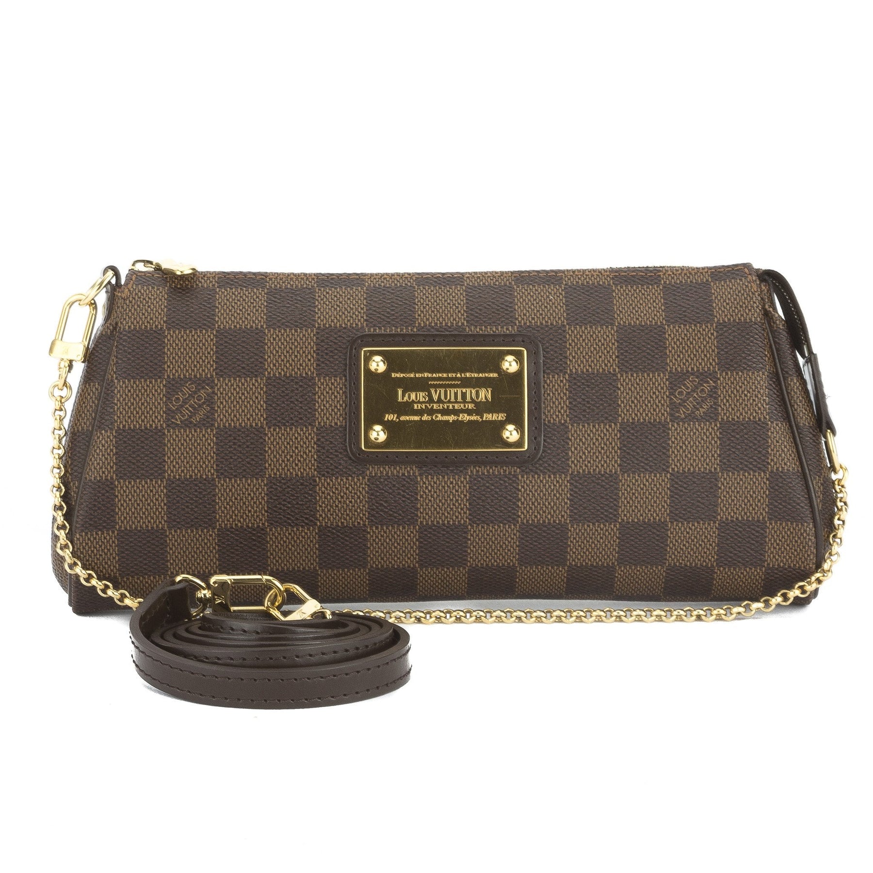 This authentic pre owned Louis Vuitton Damier Ebene Eva is so hot right now! This classic style features Damier Ebene canvas, single zip closure, and gold tone hardware. It has a versatile shoulder strap that can be worn in a number of ways, as a wristlet, shoulder bag, or even clutch!