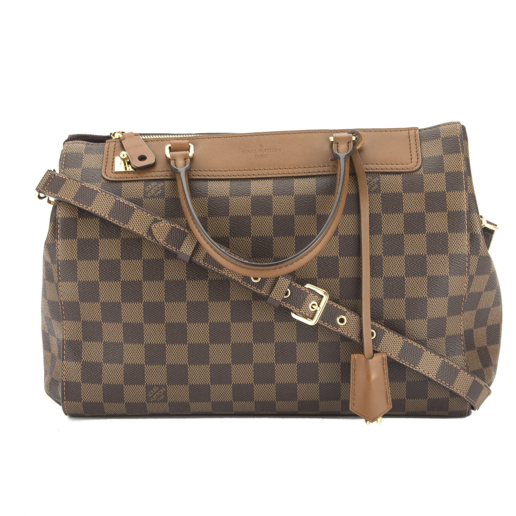 This is an authentic Louis Vuitton Damier Ebene Canvas Greenwich Boston Bag. It features brown rolled leather top handles, an adjustable leather shoulder strap, and a top leather crest and trim with a top zipper.