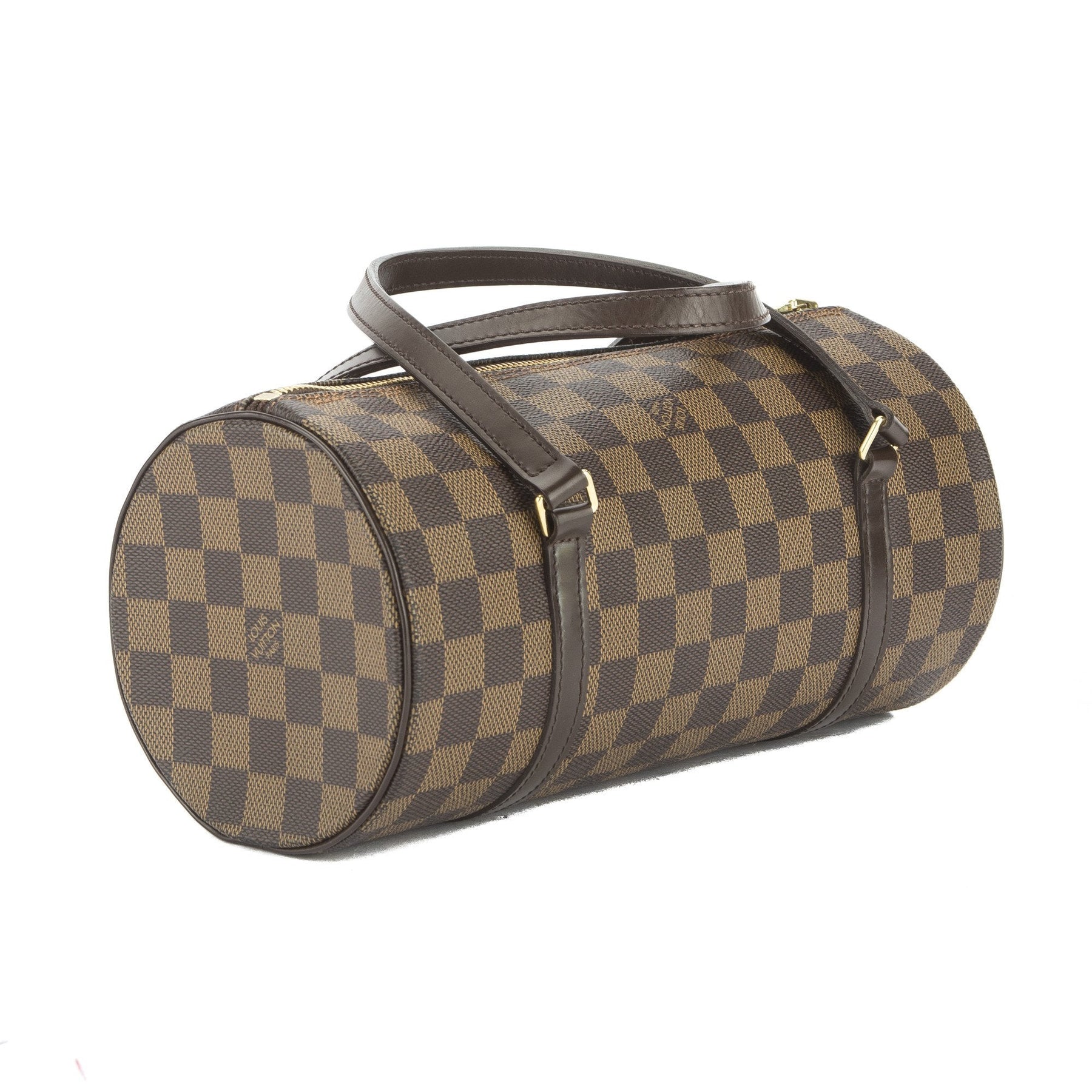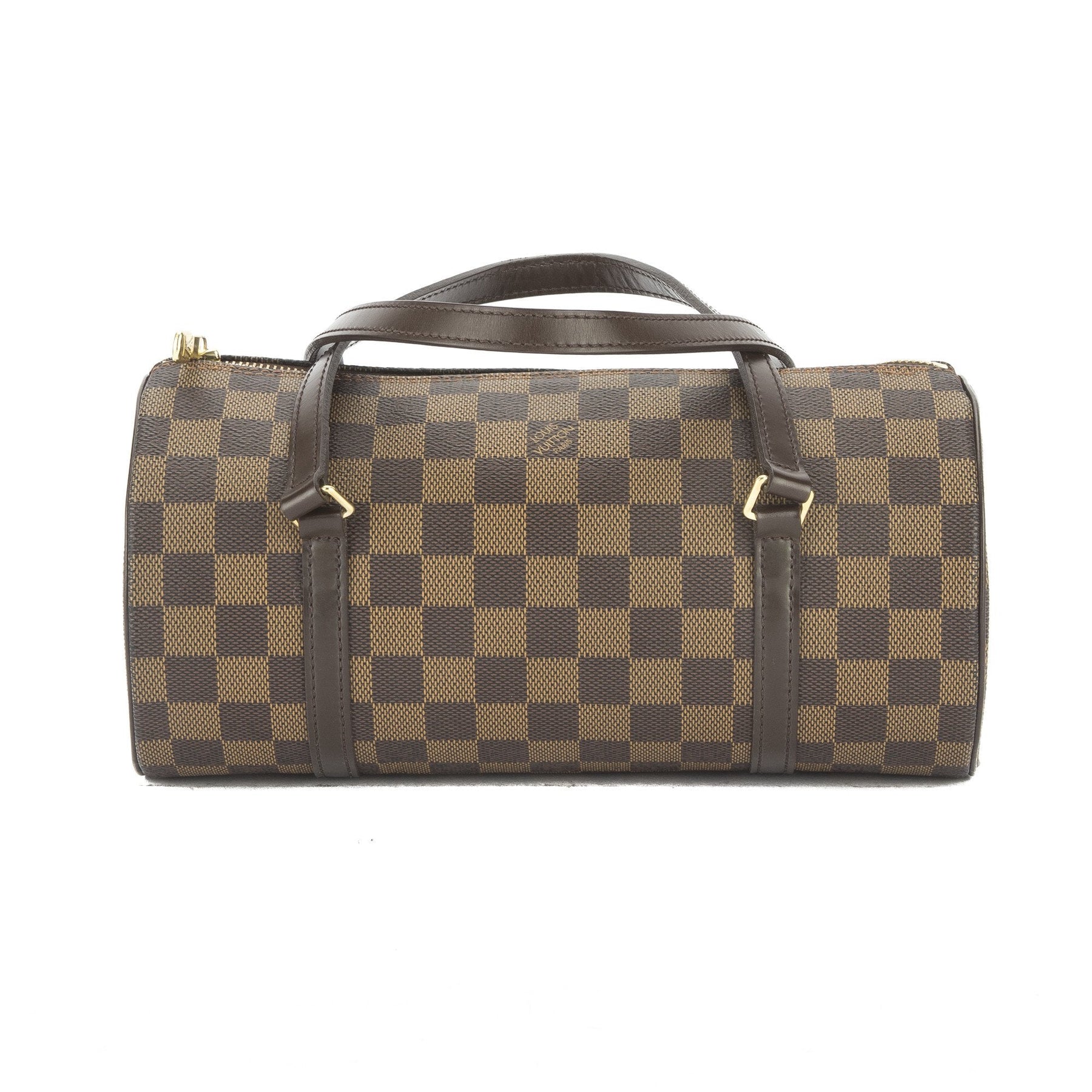 This is an authentic pre owned Louis Vuitton Papillon 26 Bag. It is made of the traditional LV Damier Ebene canvas with vachetta leather trim and straps. It has a cross-grain leather interior lining, golden brass hardware and a zipper top closure. A classic Louis Vuitton that will never go out of style!