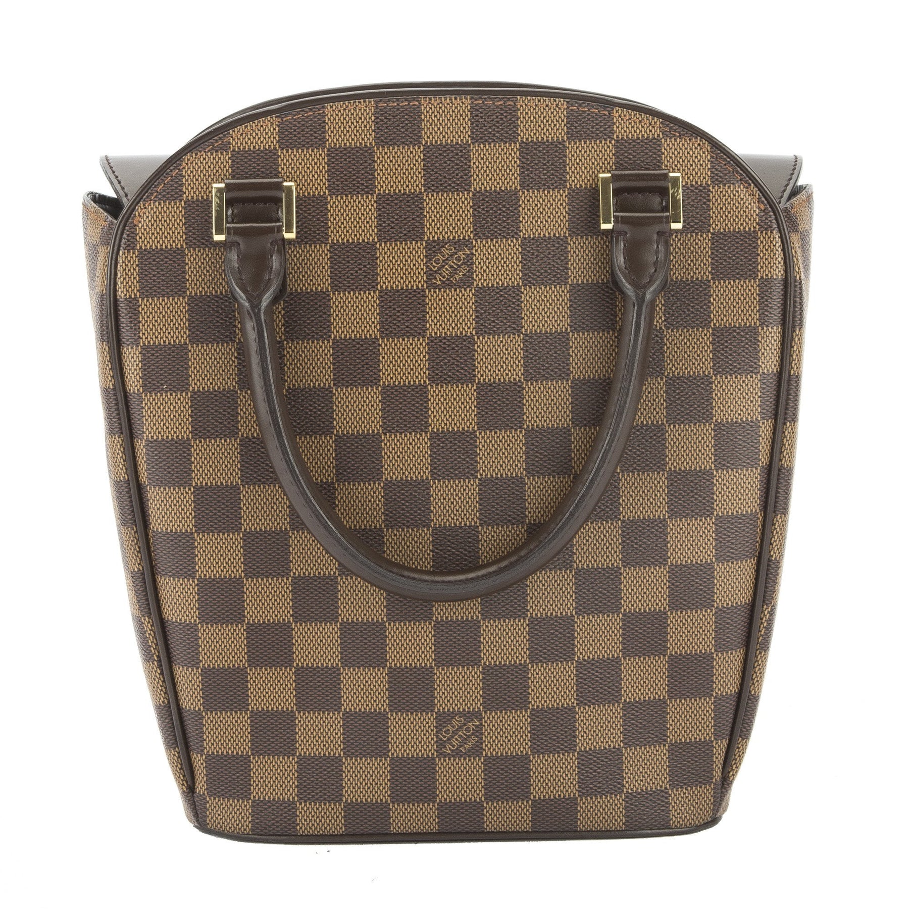 This authentic Louis Vuitton Damier Ebene Sarria Seau Bag has a chic elegant design with a feminine flair. It is made of Louis Vuitton Damier canvas with dark brown smooth leather double top handles. This is a marvelous tote for everyday use from Louis Vuitton.