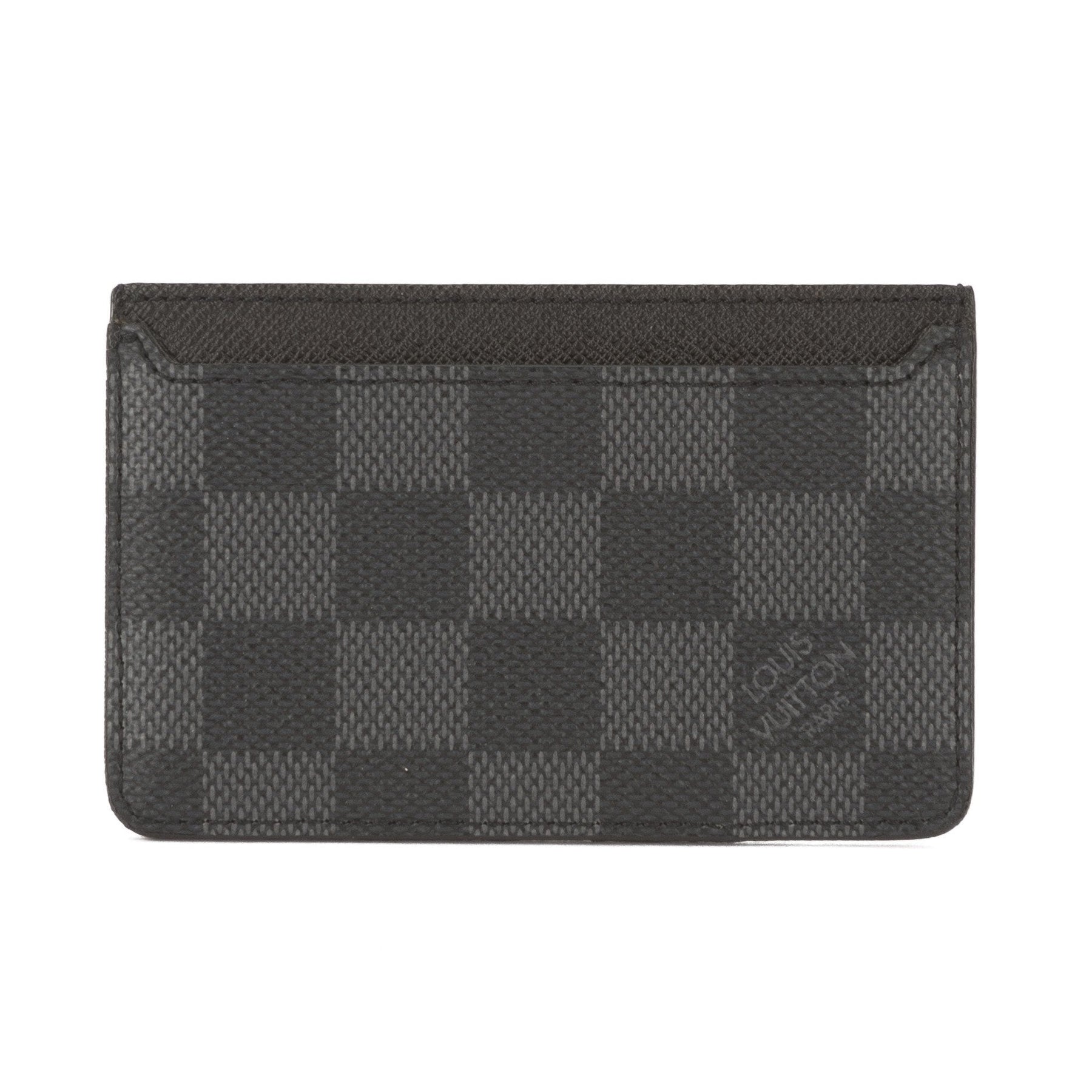 This is an authentic Louis Vuitton Damier Graphite Neo Porte Cartes Card Holder. It's a sophisticated card holder for a savvy business man. It's featured in the damier graphite canvas with black leather detail, three card slots on side, one pocket on the other side, and a center pocket with a leather lining. It's sleek and compact and slips easily into your pocket or briefcase. Keep your cards organized in this classy card holder by Louis Vuitton.