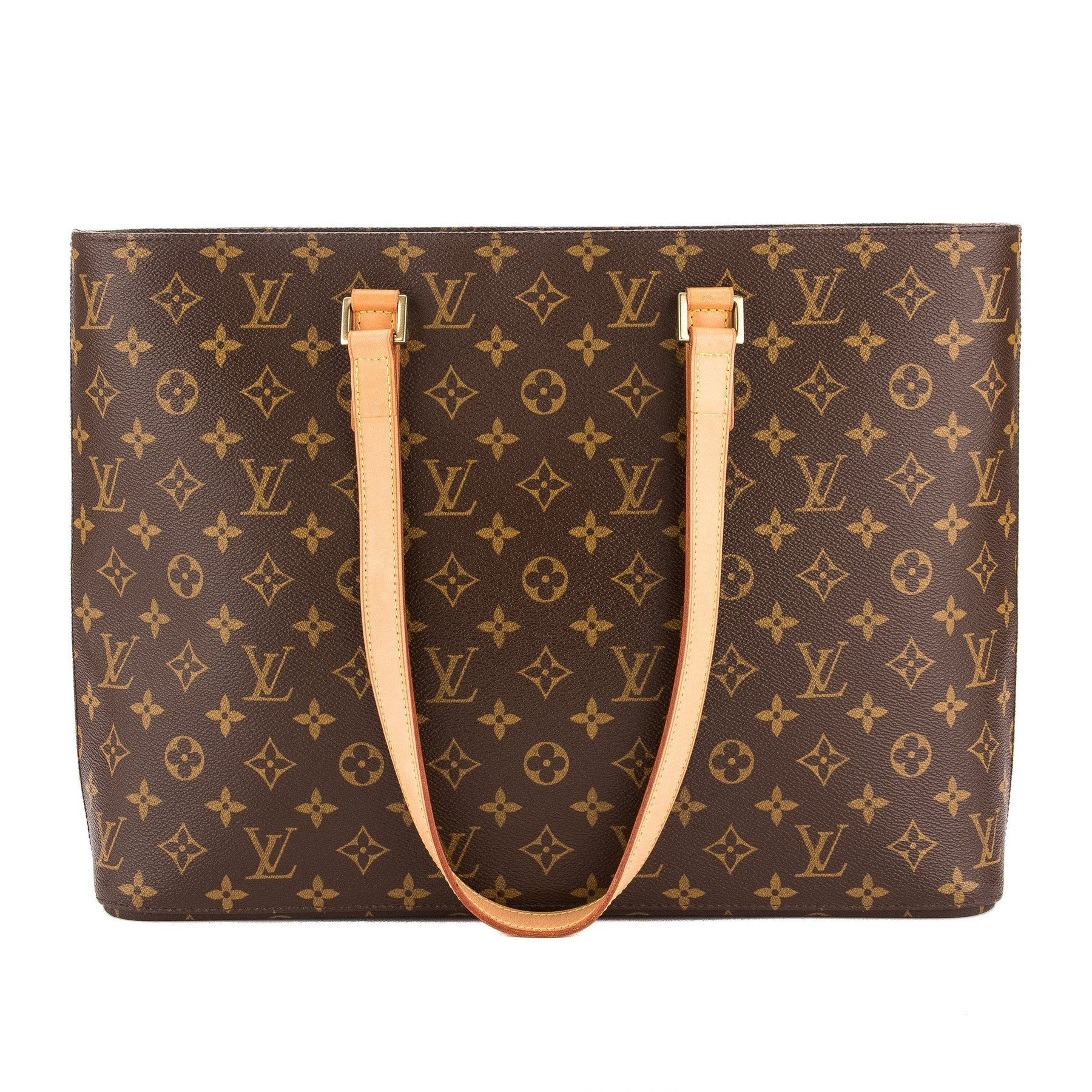 This is an authentic LOUIS VUITTON Luco Tote Bag. This fashionable tote has that classic Louis Vuitton pose with minimal embellishments. It features the Monogram canvas with flat vachetta leather handles and gold-tone pieces. It has a spacious interior with multiple pockets (one zip pocket, two flat pockets, and a cellphone pocket), a beige alcantara lining, a d-ring, and a zip closure. It's a sleek and sophisticated tote for the everyday woman! Grab the Luco today!