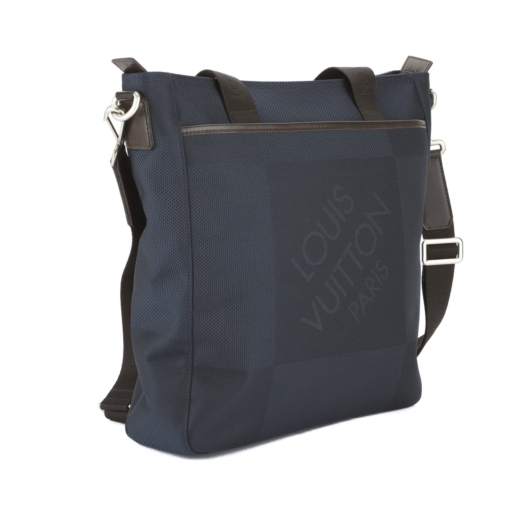 This is an authentic Louis Vuitton Damier Geant Jongleur Bag in Ocean Blue. The Jongleur is a modern, sophisticated tote in a blue damier geant canvas. The geant is made of a durable nylon material - it's lightweight but able to withstand a multitude of conditions. It has smooth brown leather details, brown canvas straps, and a removable-adjustable cross-body strap. It has an external zip pocket, an open pocket, and silver-tone hardware. The interior has a textile lining with one open pocket and ample space for your essentials and more. The great tote for every day. Carry all your items with ease and style - Get the Jongleur today!