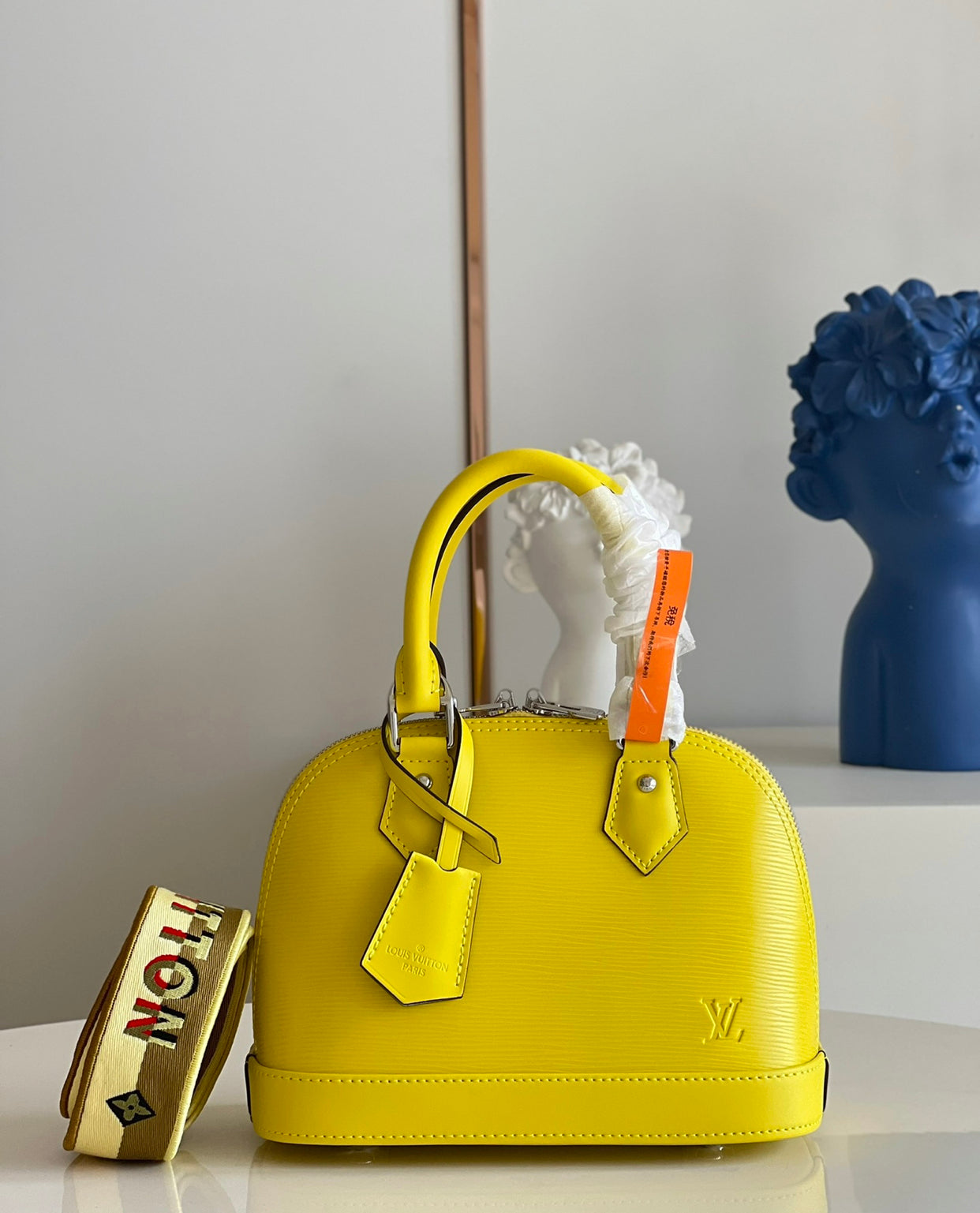 One of the House’s most recognizable bags, the adorable Alma BB gets a sporty makeover thanks to a new Jacquard strap. The fashionably wide strap is embroidered with Louis Vuitton on one side and Monogram Blossoms on the other, and features delicate stitching along its edges. Made from colorful Epi leather, this bag will definitely turn heads.