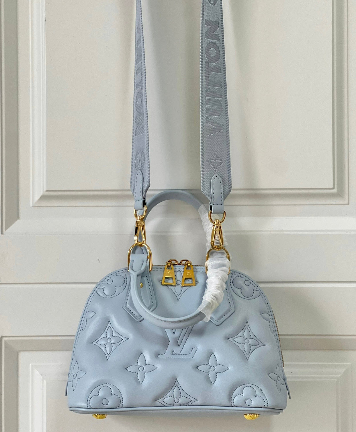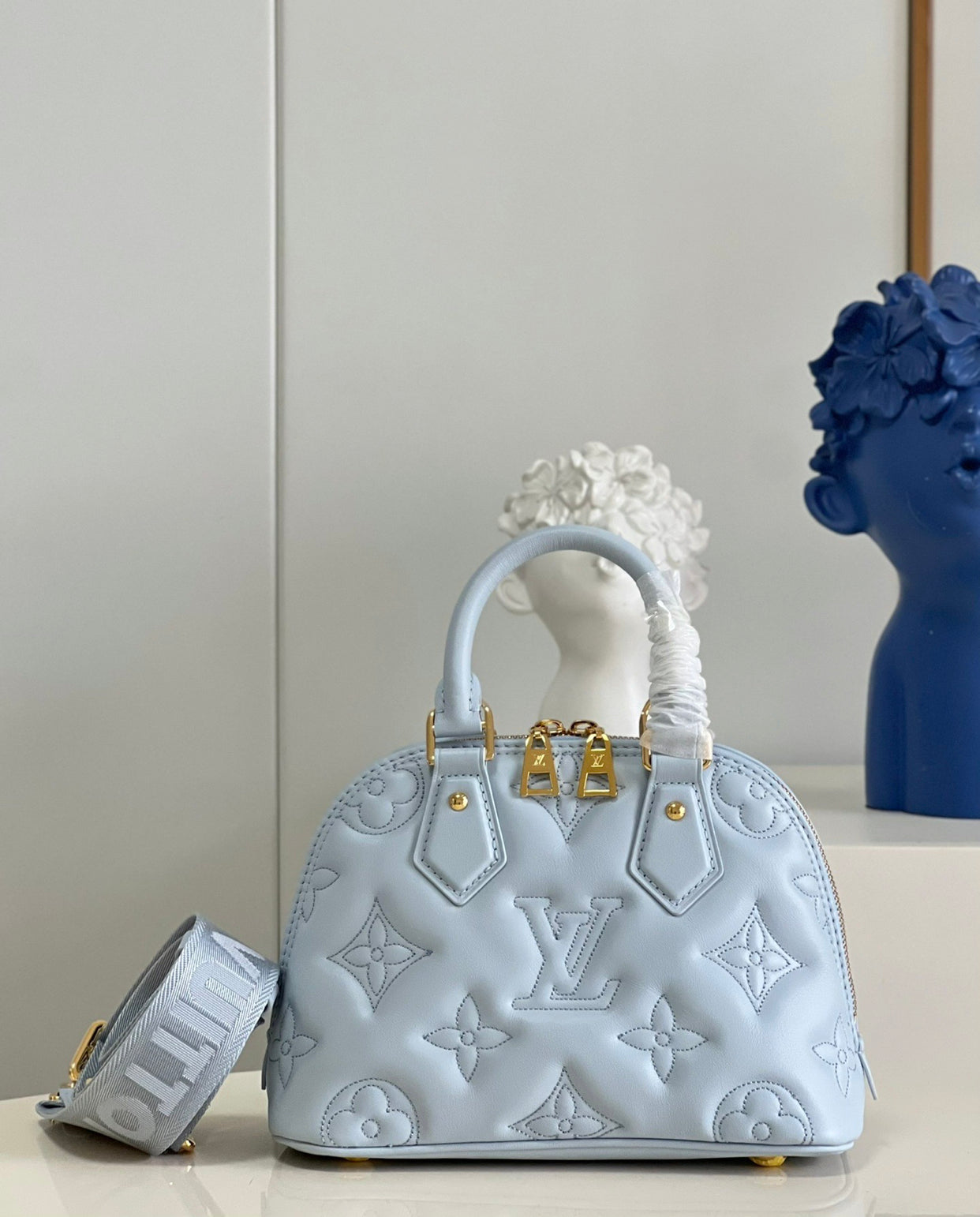 Made from quilted calfskin embroidered with the Monogram motif, the Alma BB handbag is the direct descendant of the Art Deco original from the 1930s. Crafted details like the two rolled-leather top handles complement the puffy leather. Equipped with a removable and adjustable strap, this small bag is perfect for cross-body wear in addition to hand carry.