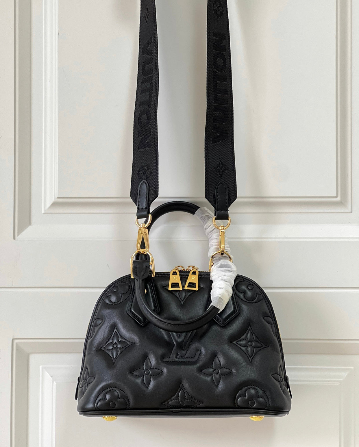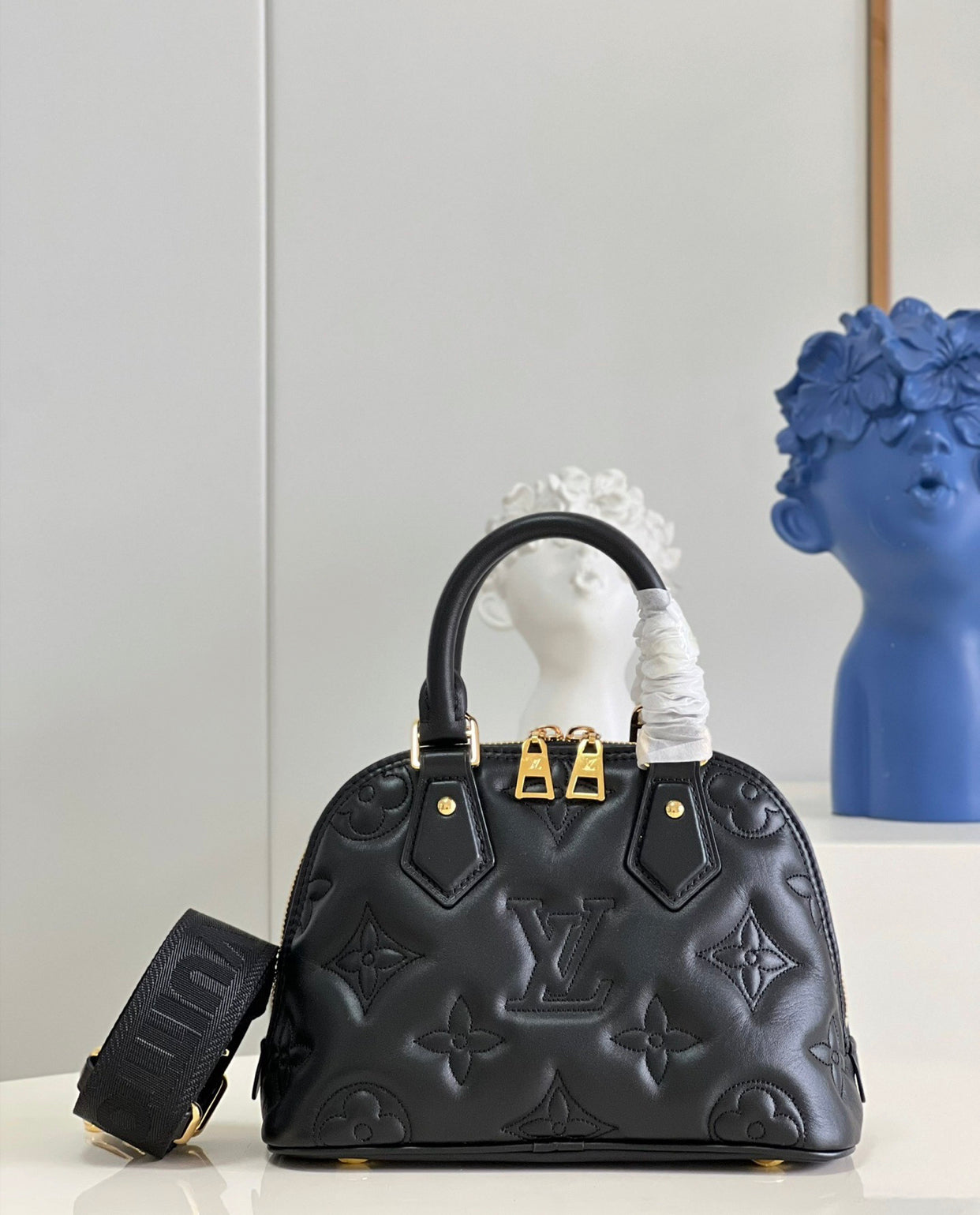Made from quilted calfskin embroidered with the Monogram motif, the Alma BB handbag is the direct descendant of the Art Deco original from the 1930s. Crafted details like the two rolled-leather top handles complement the puffy leather. Equipped with a removable and adjustable strap, this small bag is perfect for cross-body wear in addition to hand carry.