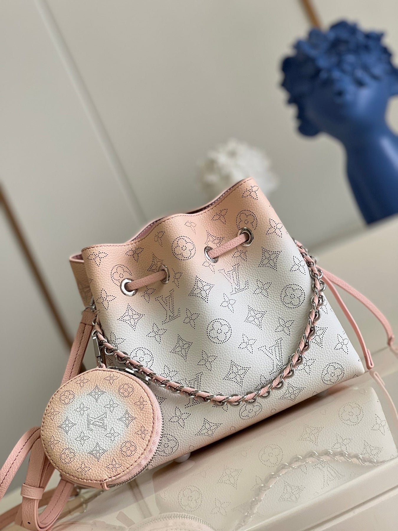 The Bella bag is reinterpreted with a delicate gradient color animation on the iconic Mahina perforated calf leather, with tone on tone calf leather trim. The gradient halo effect is achieved by spraying the dye by hand to gradually pigment the leather, making each bag unique. This small bucket bag is secured with a drawstring and includes a detachable, round coin purse.