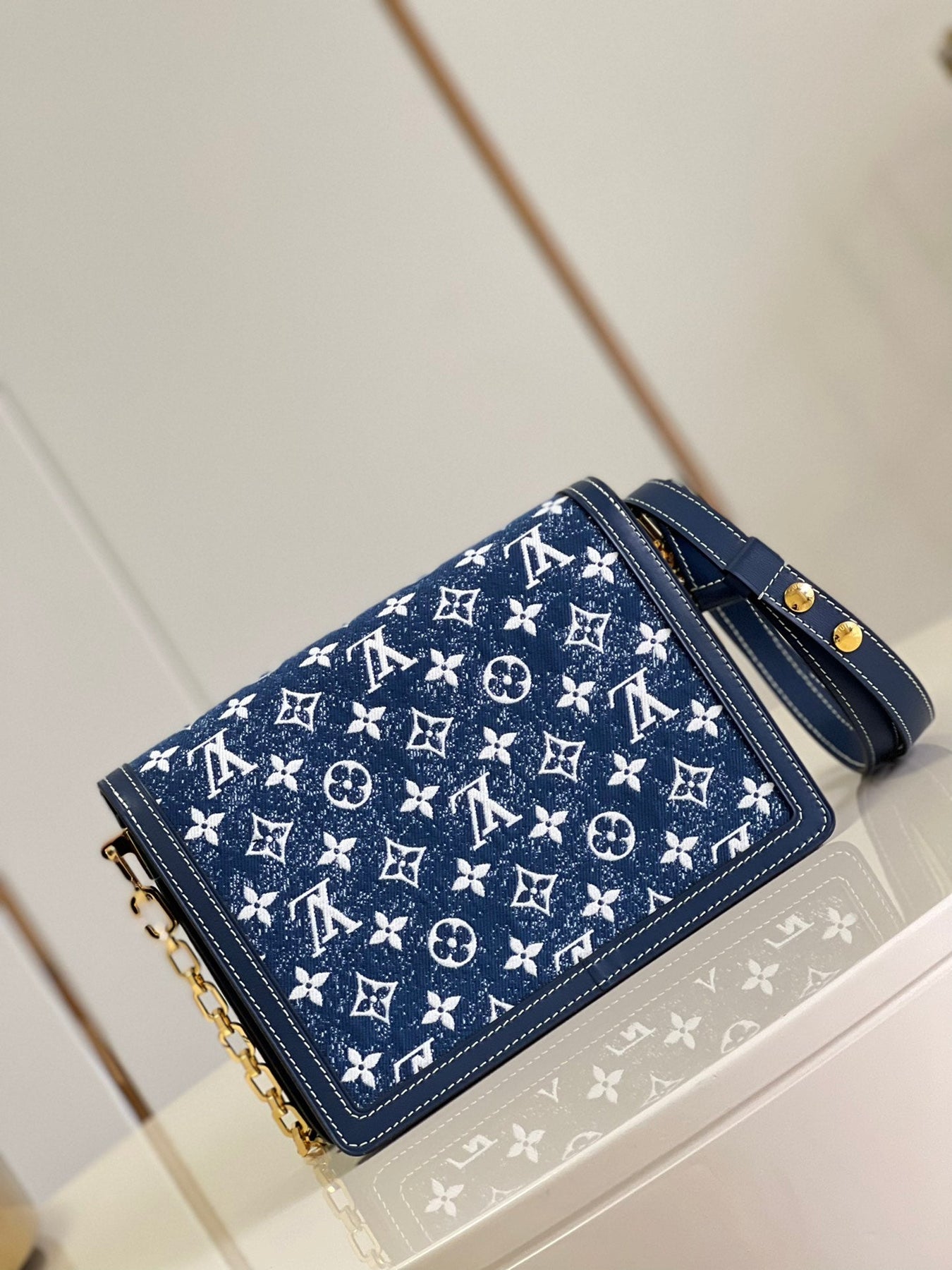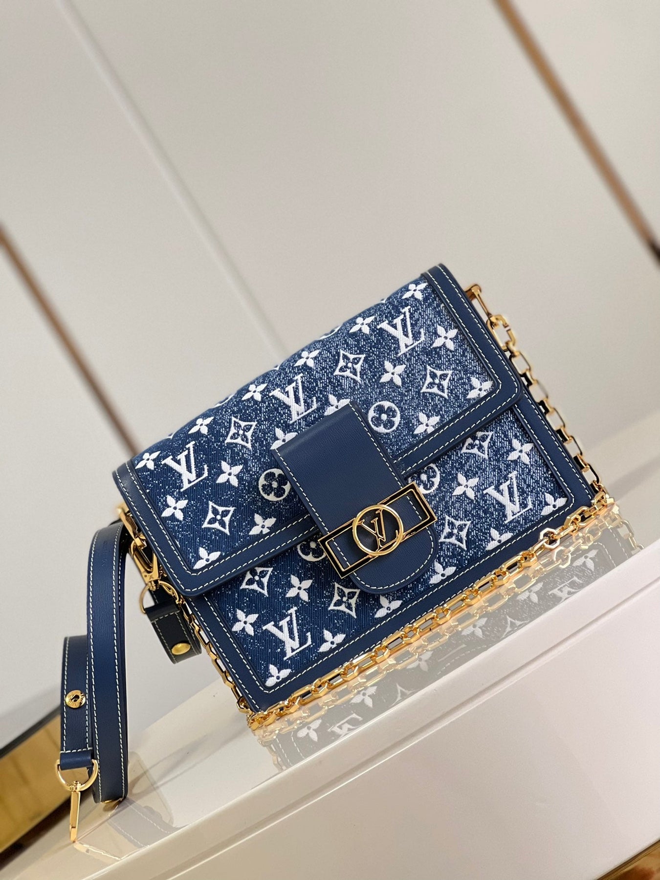 The Dauphine MM handbag, with its vintage lines, is fashioned from faded denim jacquard textile with a Monogram pattern and finished in navy-blue calfskin trim. Sophisticated details like the gold-color LV Circle lock add charm while the removable shoulder strap and two inside compartments bring practicality.