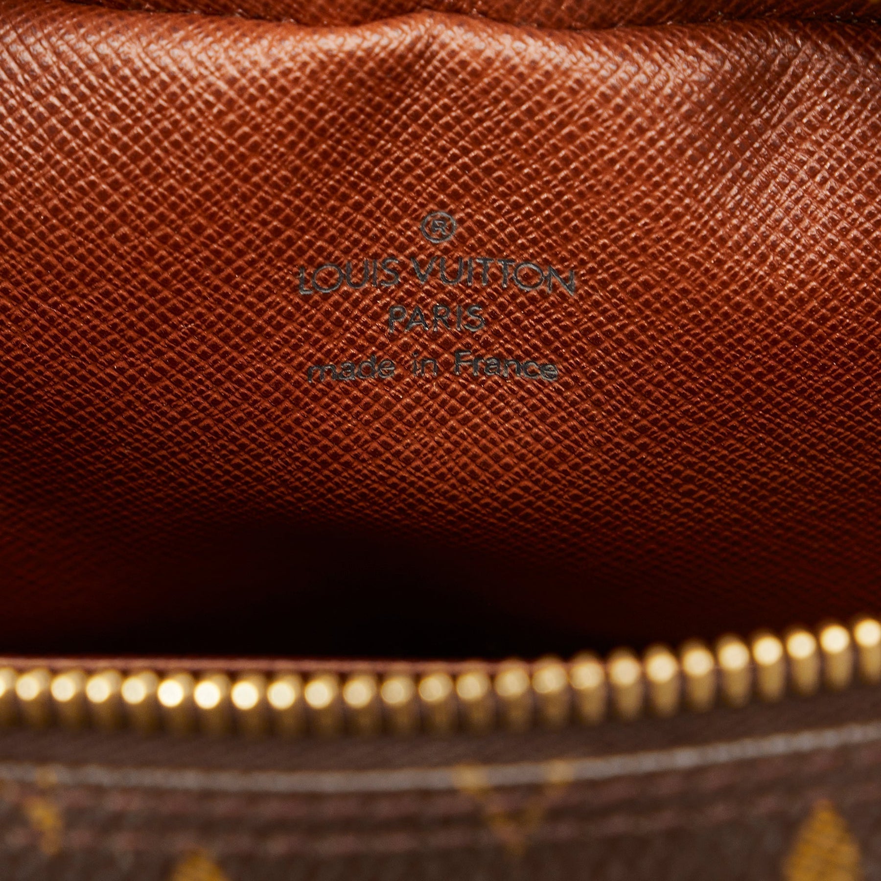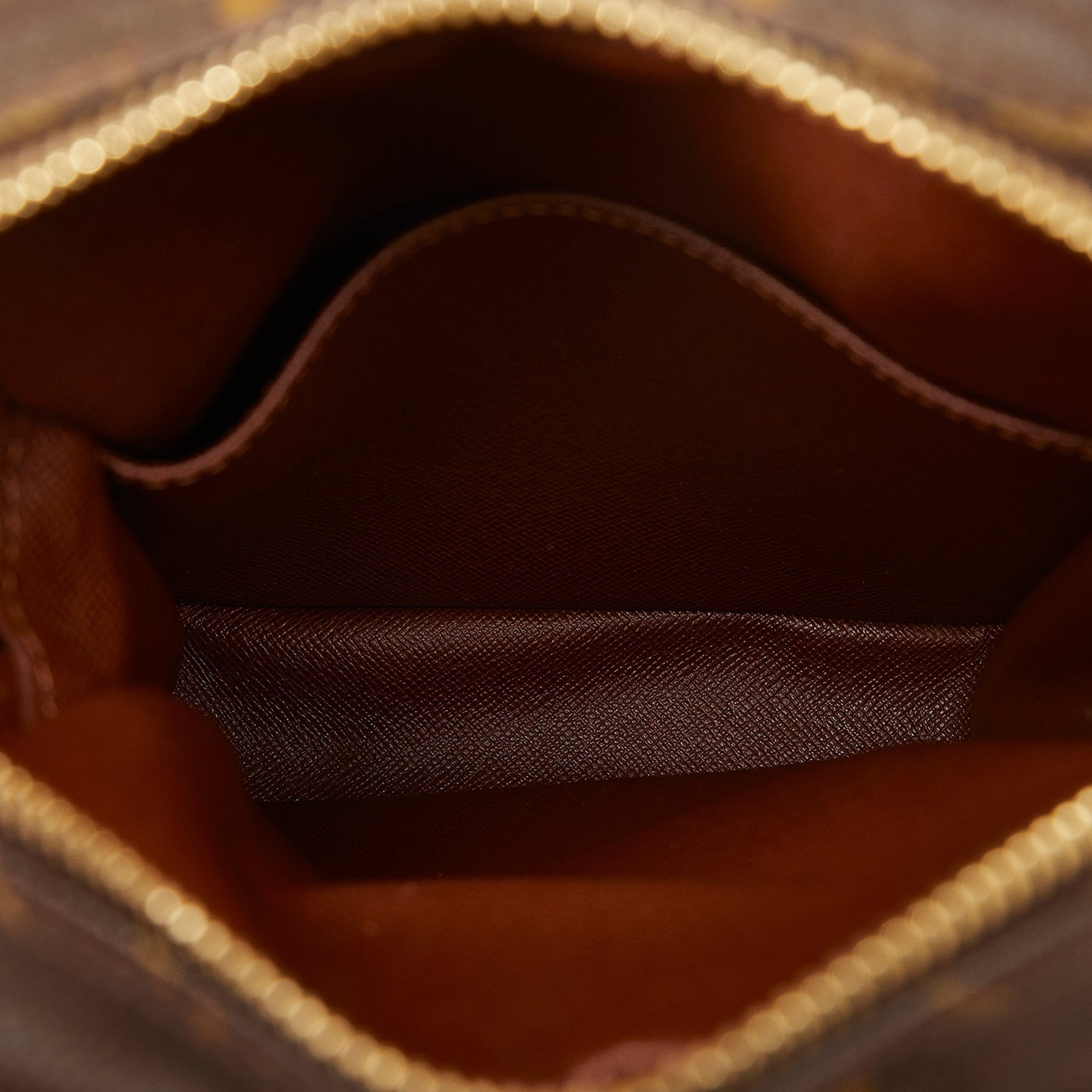 The Amazone features a monogram canvas body with vachetta leather trim, an adjustable shoulder strap, a top zip closure, a front exterior zip pocket, and an interior slip pocket.