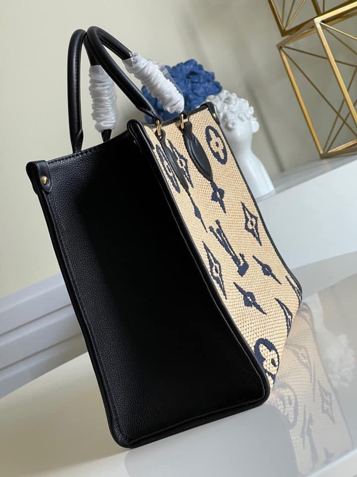 Perfect for travel or a day at the beach, the OnTheGo MM tote bag is made from Monogram Raffia with leather handles, shoulder strap, and gussets. Monogram Raffia is composed of recycled cotton and sustainably sourced viscose base with an embroidered Monogram Giant pattern. This tote has a removable bag charm in a contrasting color.