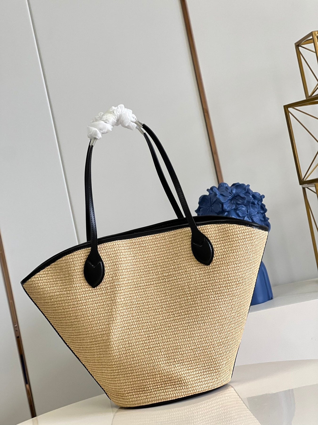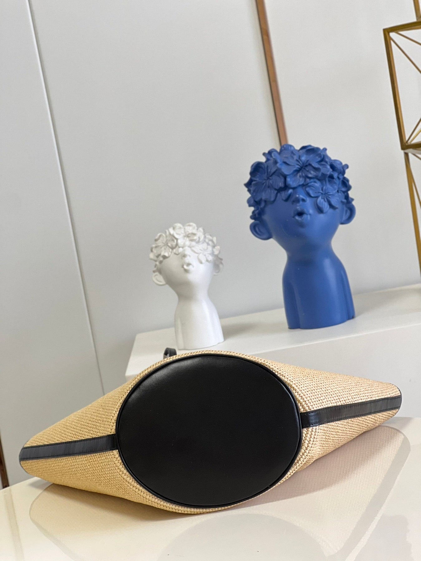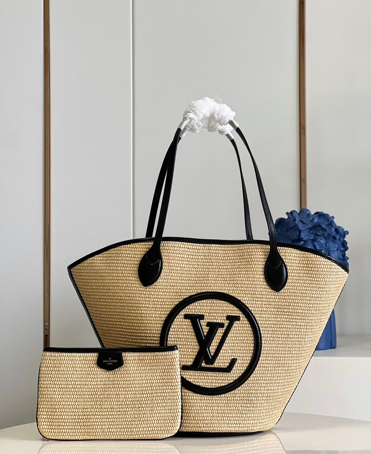 • Removable zipped raffia pouch