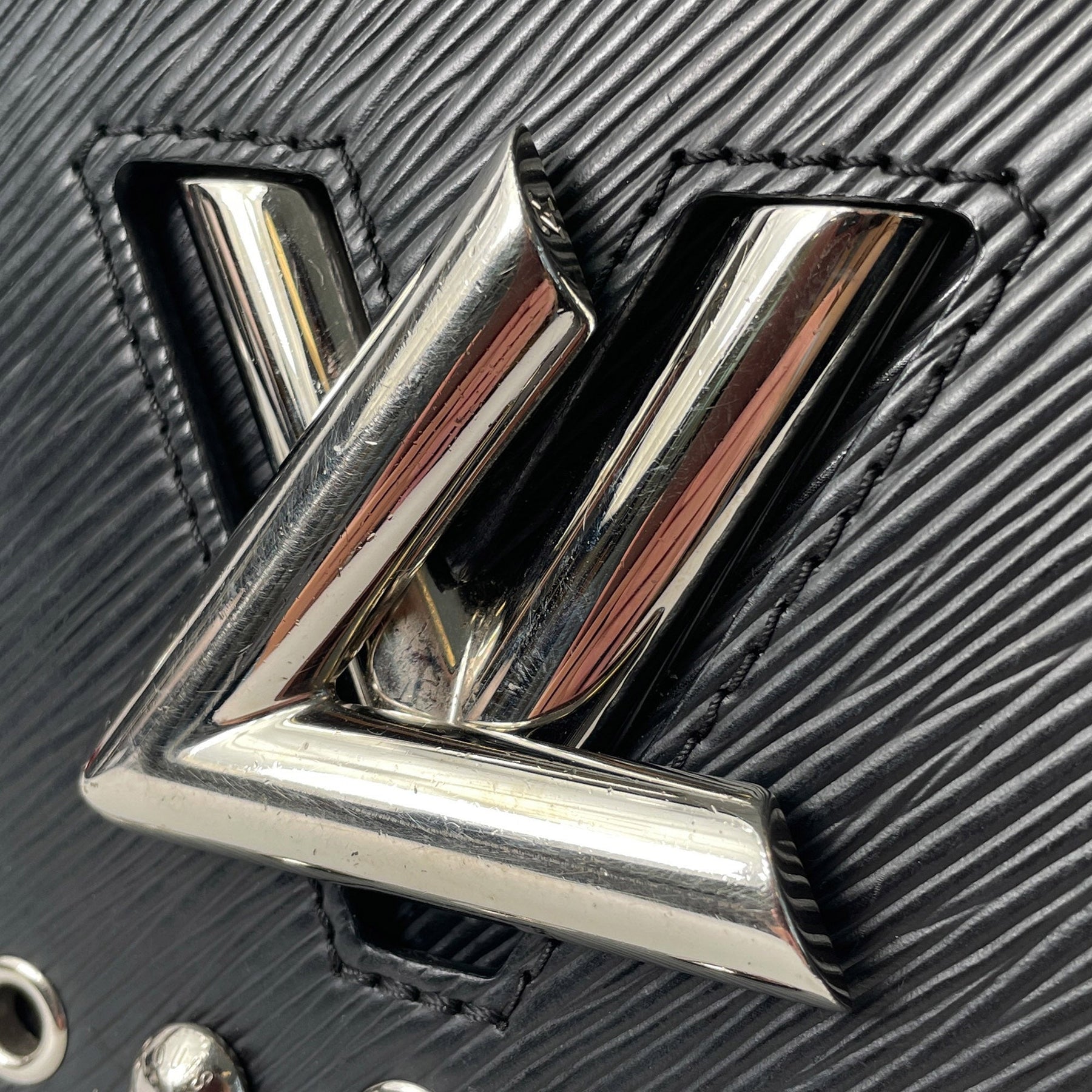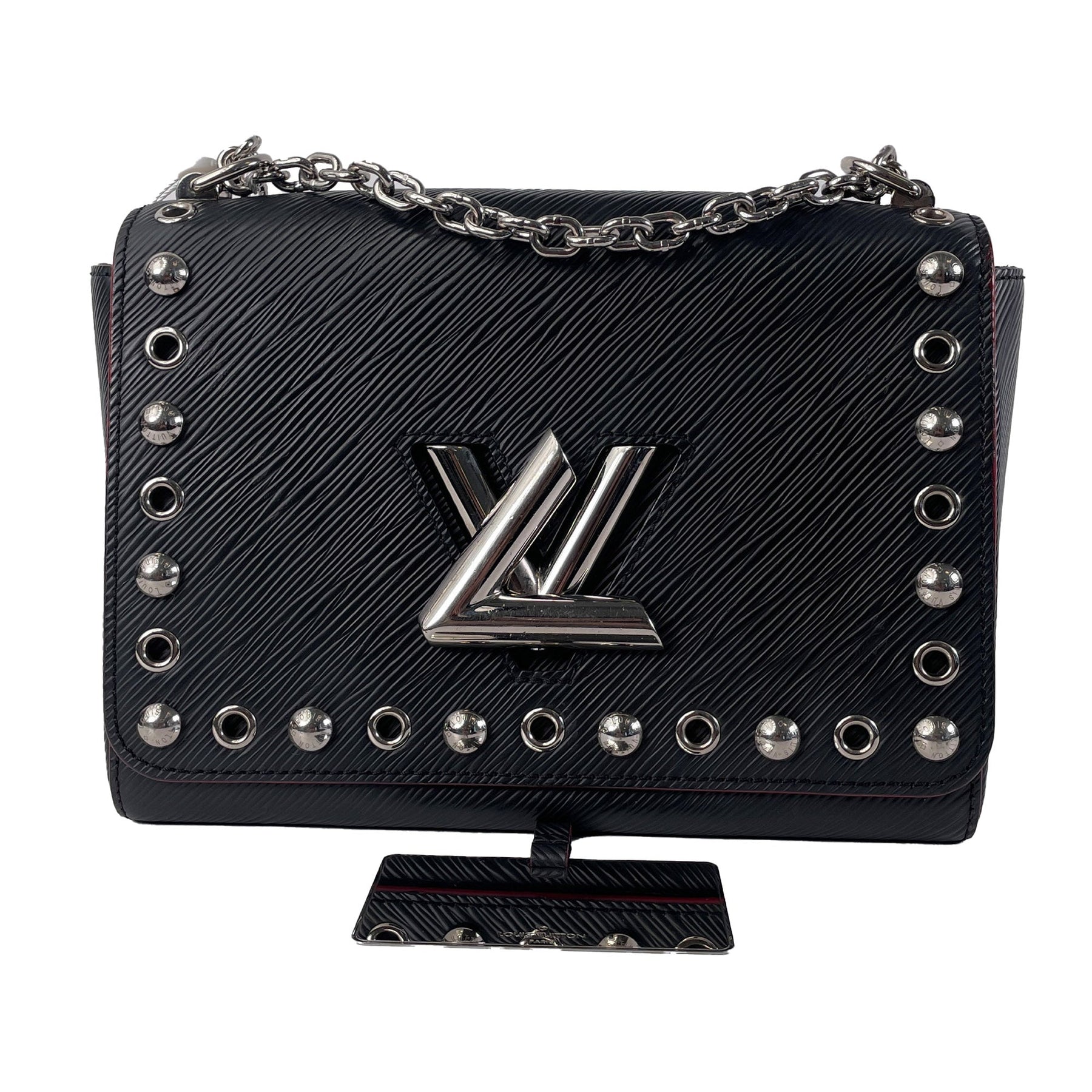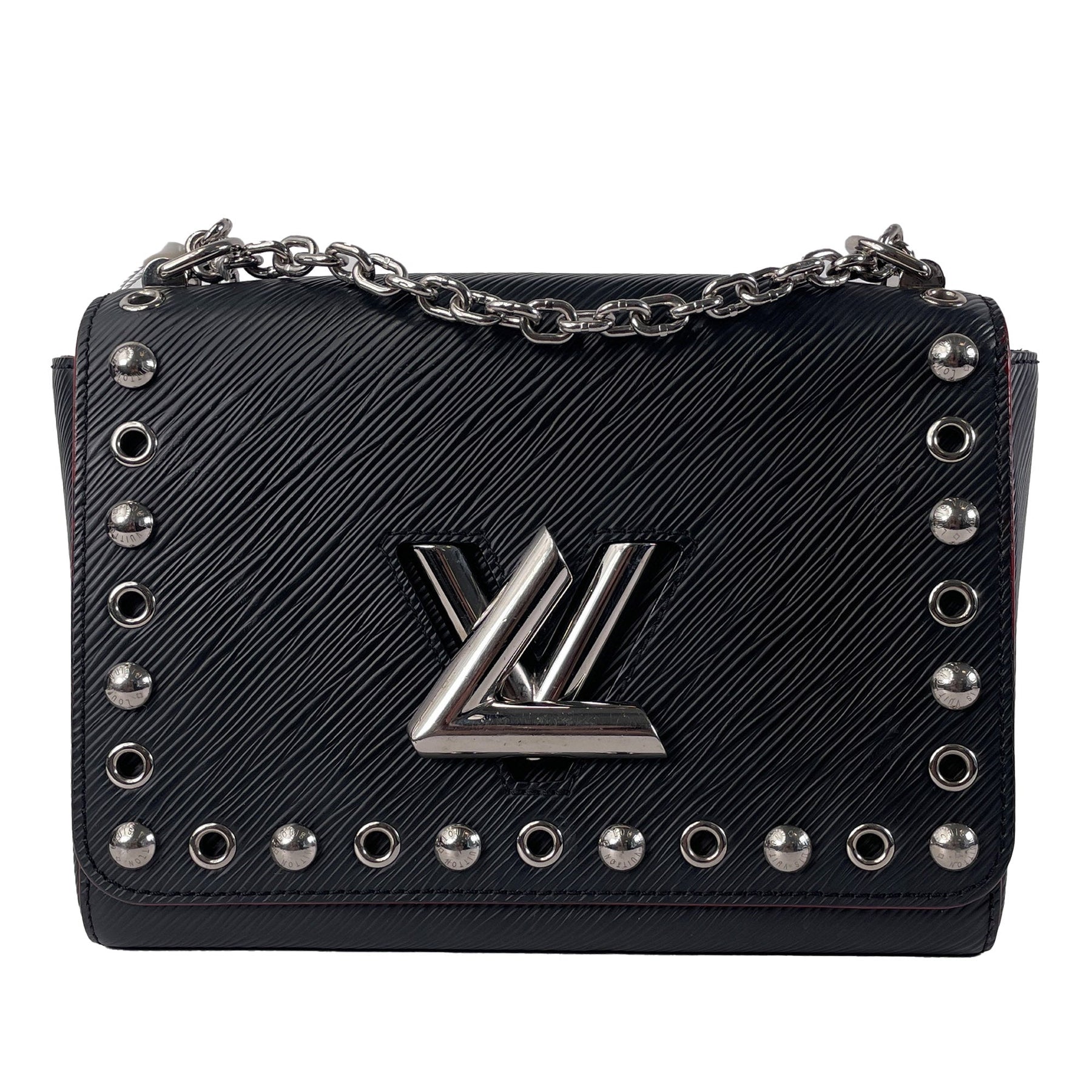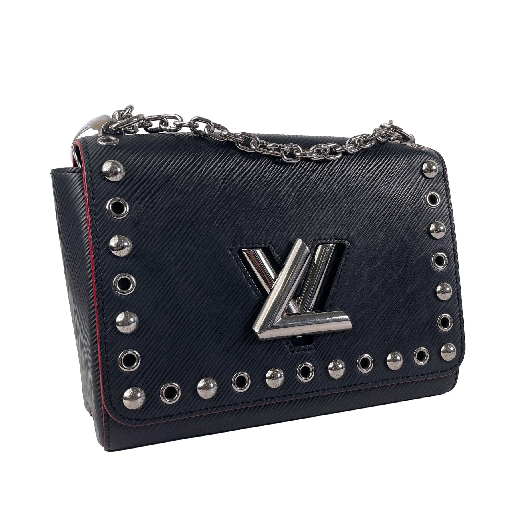 The Twist MM features a studded epi leather body, a silver-tone curb chain strap, a front flap with an LV twist lock closure, and interior pockets.