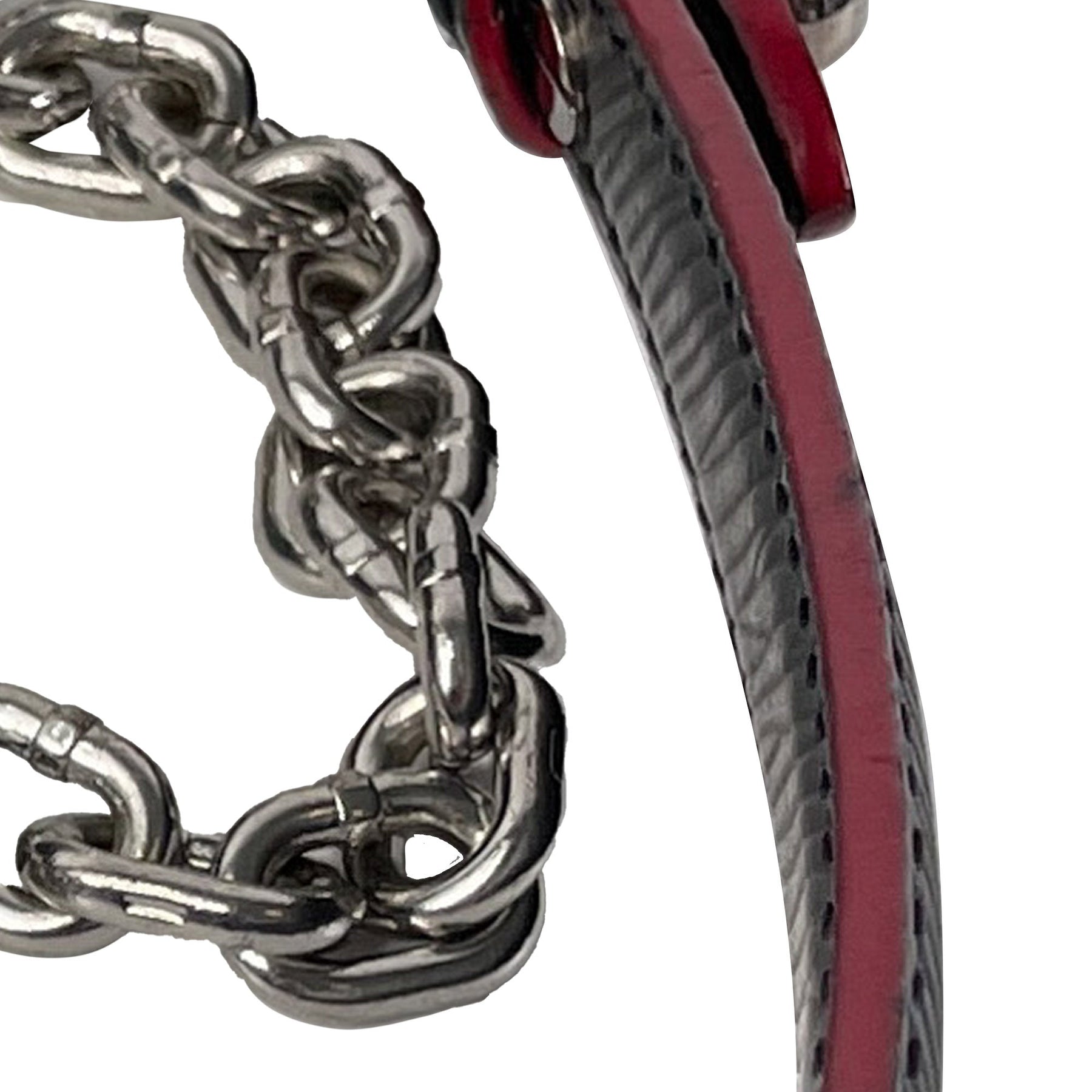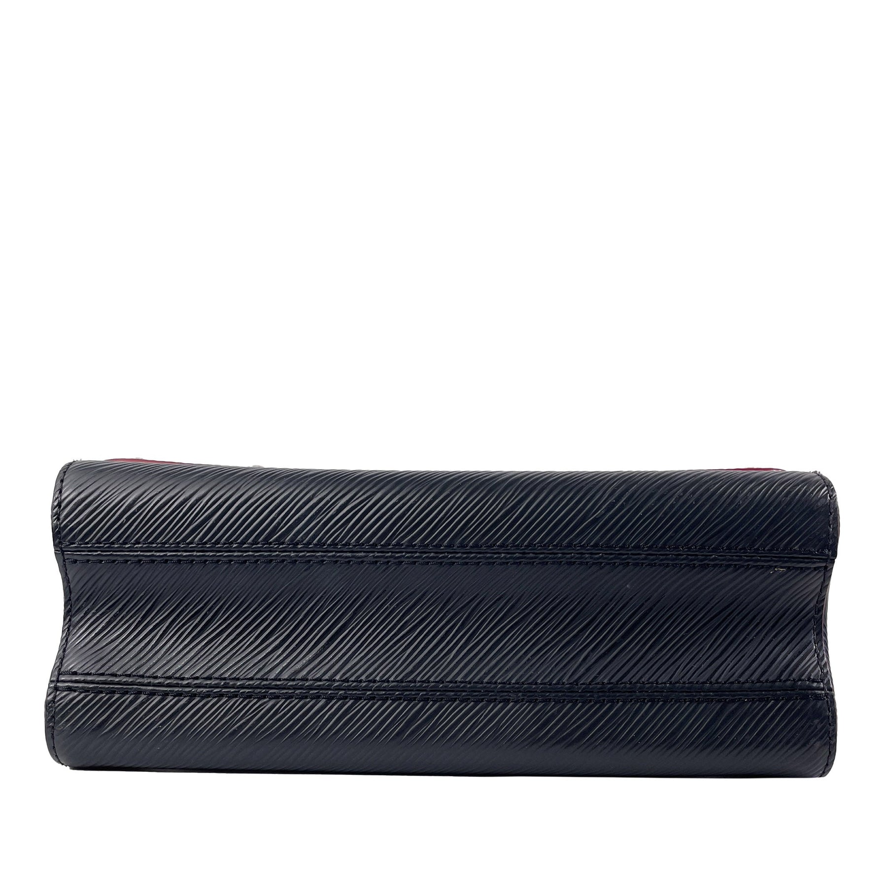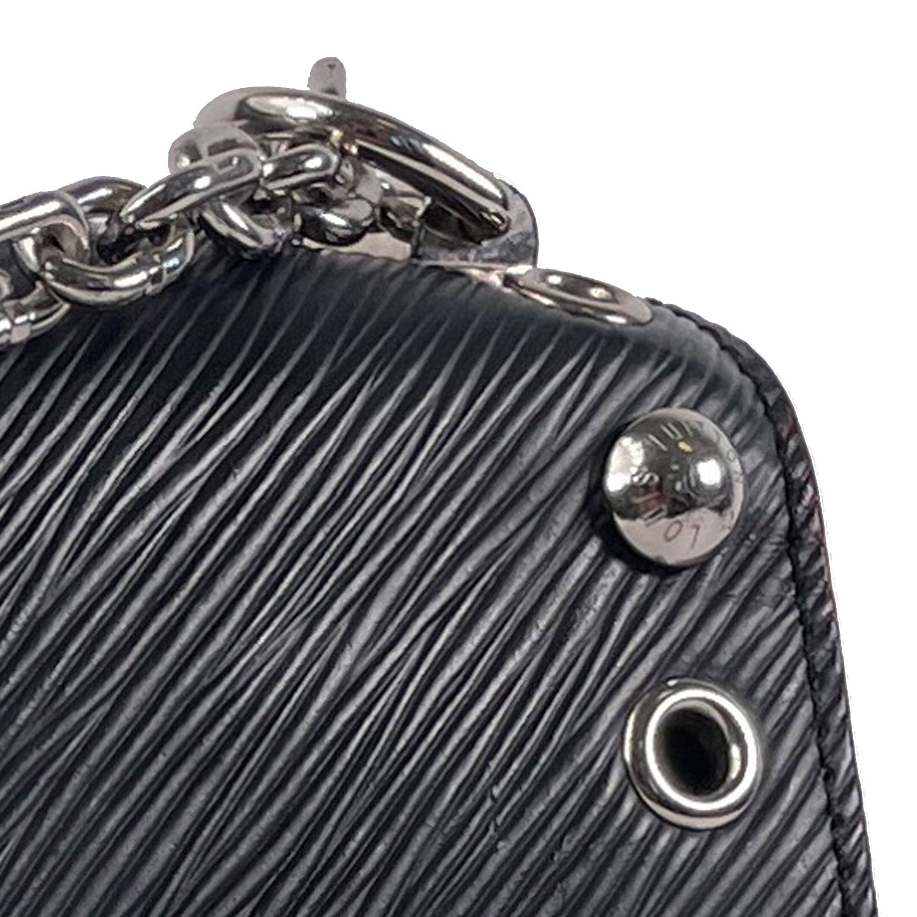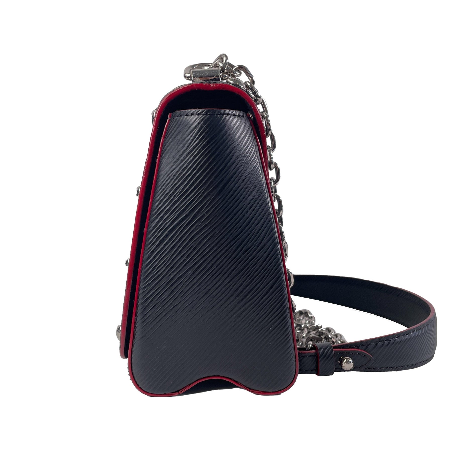 The Twist MM features a studded epi leather body, a silver-tone curb chain strap, a front flap with an LV twist lock closure, and interior pockets.